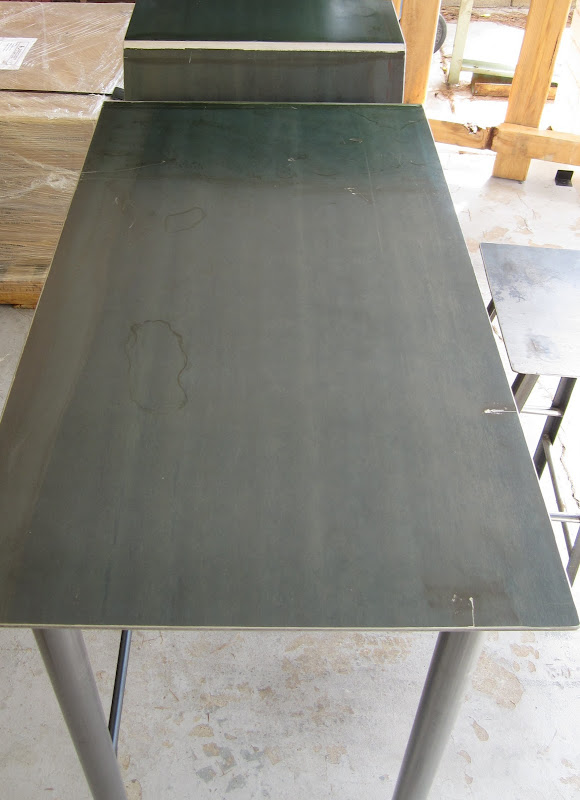 This desk has a modern yet vintage look. It’s made of steel and has a stylish V in the top for holding magazines, books, etc. This piece is 60″ wide x 38″ tall x 24″ deep which is working or bar height, and custom sizes are available. It’s heavy, approximately 250 lbs, and could have casters too to make it easy to move around. Priced at $1,475.