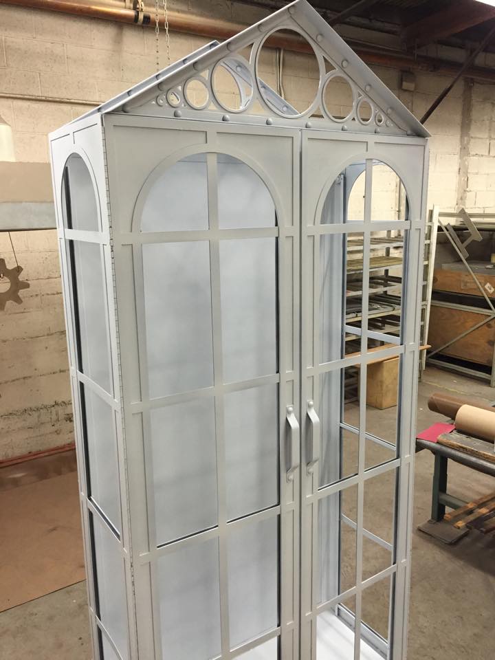 After returning from Europe, we were inspired to create this conservatory like piece. We visited places like Harrods, Selfridges, the gardens of Versailles, all of which became a part of this design. The frame is handmade steel which is welded and riveted in place. The cabinet and shelves use tempered glass throughout.