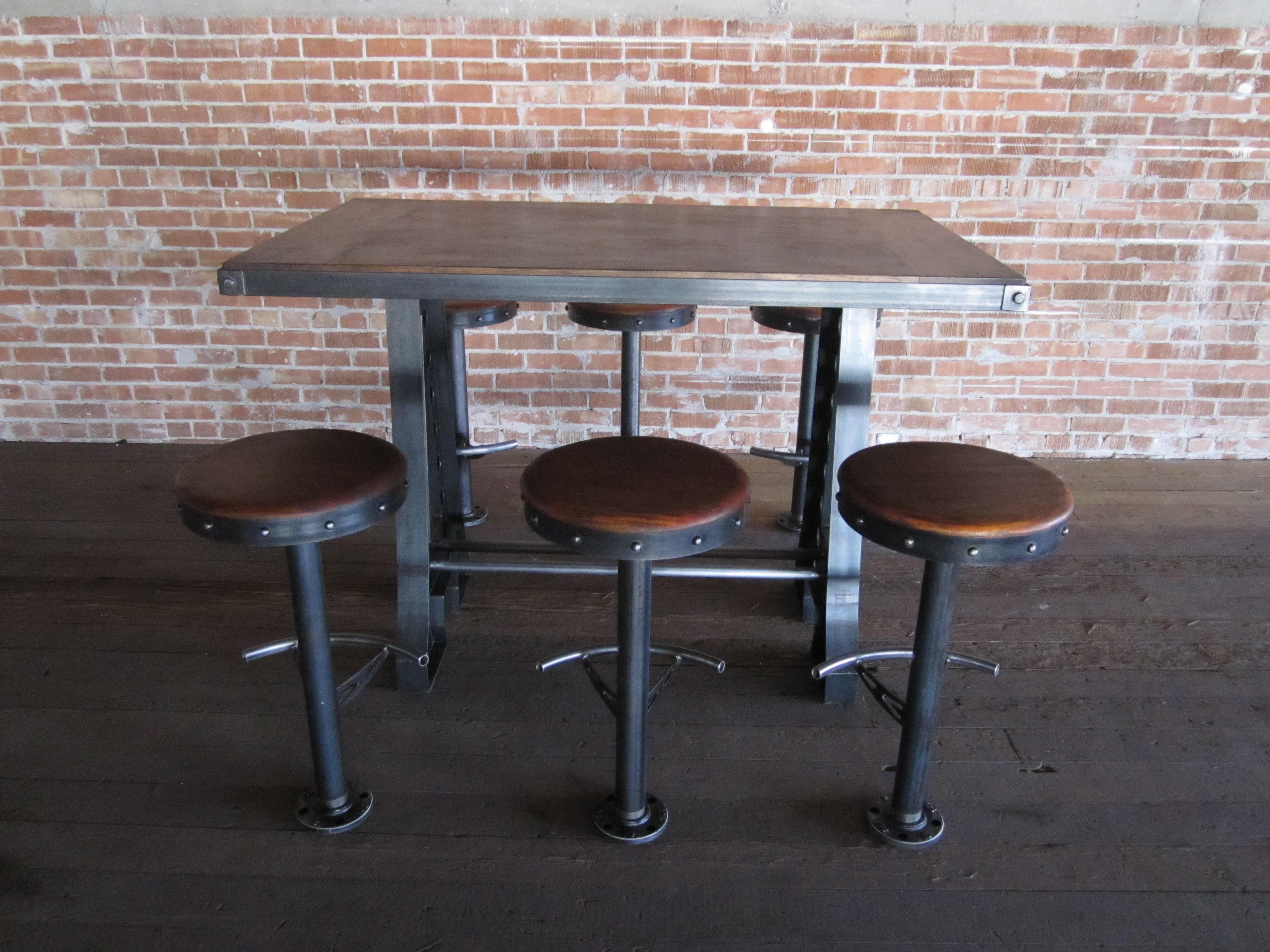 A Frame bar table with Bolt Down stools in mahogany
