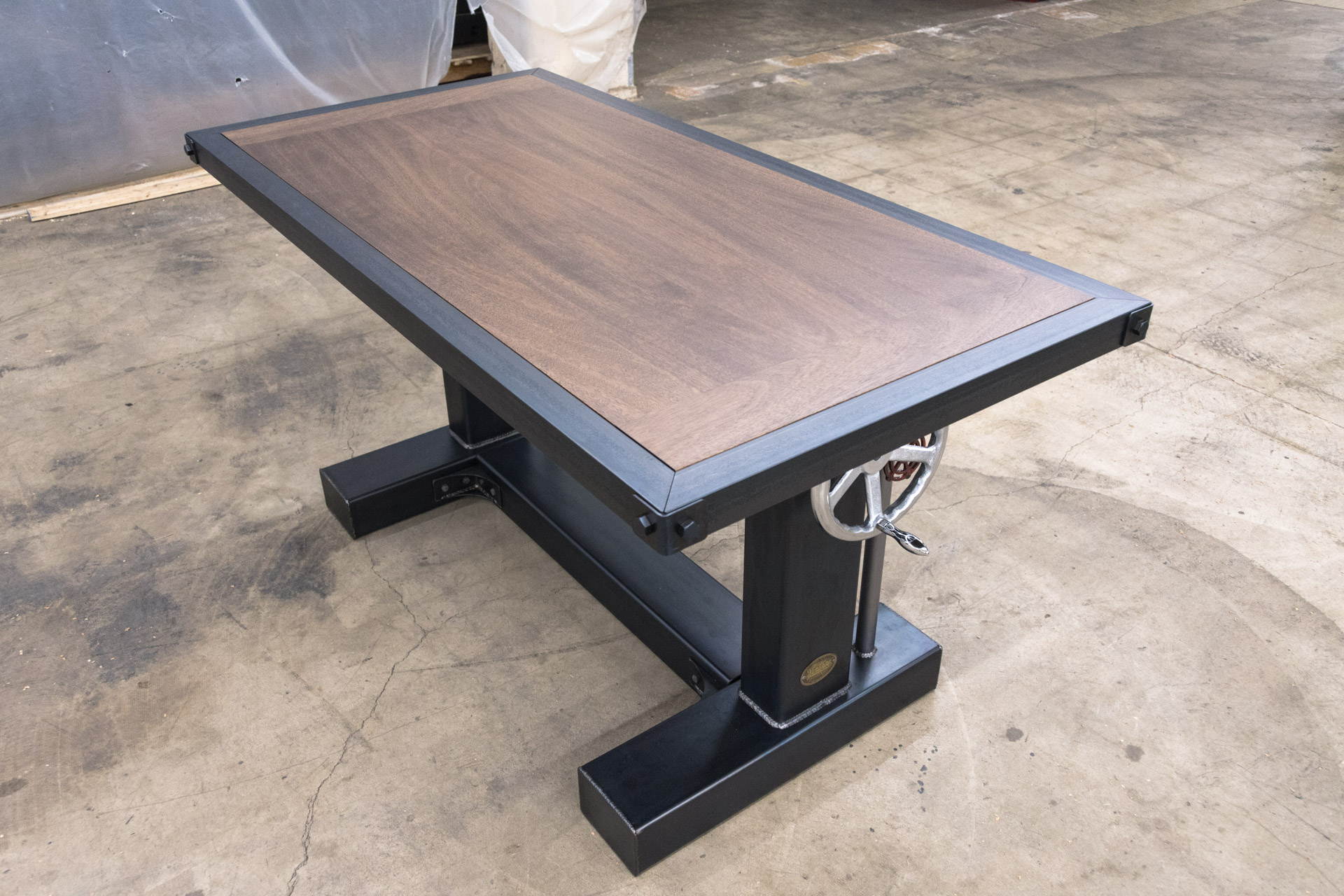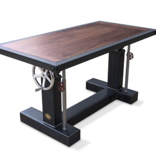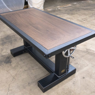 We built this custom adjustable height Crank Desk for a client that was tight on space. The 5′ x 3′ solid mahogany top has our optional top mount metal trim which serves two purposes, to protect the wood edge from impacts, and to visually tie the base into the top. The bolted corners provide extra measures as the corners are hit the most.