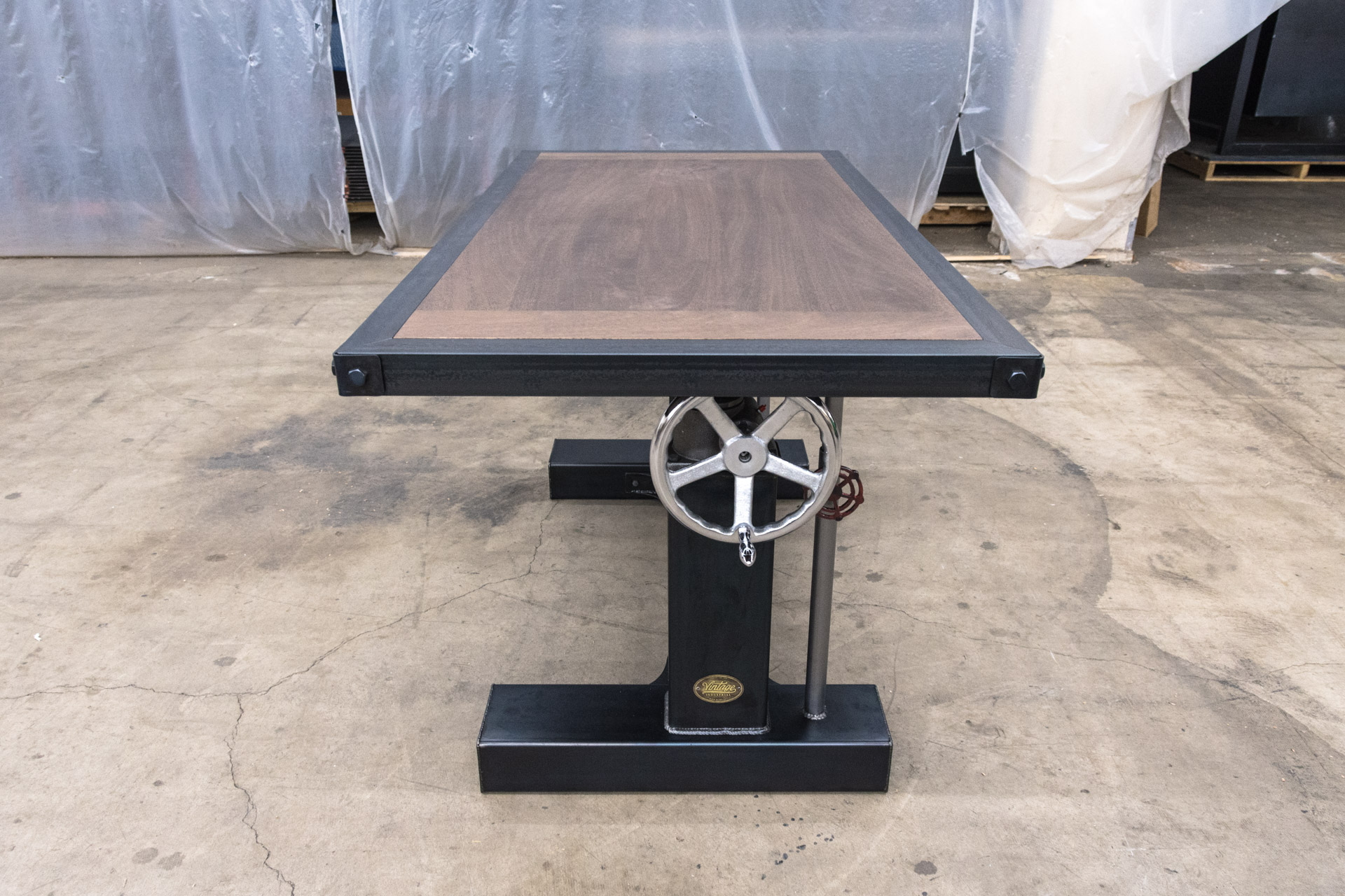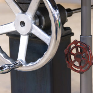 This desk has two 3 ton mechanisms which allow it to adjust in height from 30″ to 42″ (the height can be customized too), or sitting to standing height. This makes it very versatile while adding an extra layer of comfort. The designer spends a lot of time at his desk and having the ability to adjust the keyboard height some, or to stand while working, makes all the difference on a long work day. Turning the 10″ chrome crank wheel adjusts it up and down. The smaller red crank handles and extension tubes are added to stabilize the top once the height is set. We spent a lot of time engineering and testing this design over the last 7 years, making sure it’ll hold up to any abuse thrown at it. The height mechanisms are built to be used 24/7 in industrial machinery, so rest assured that this desk is built to last several centuries.
