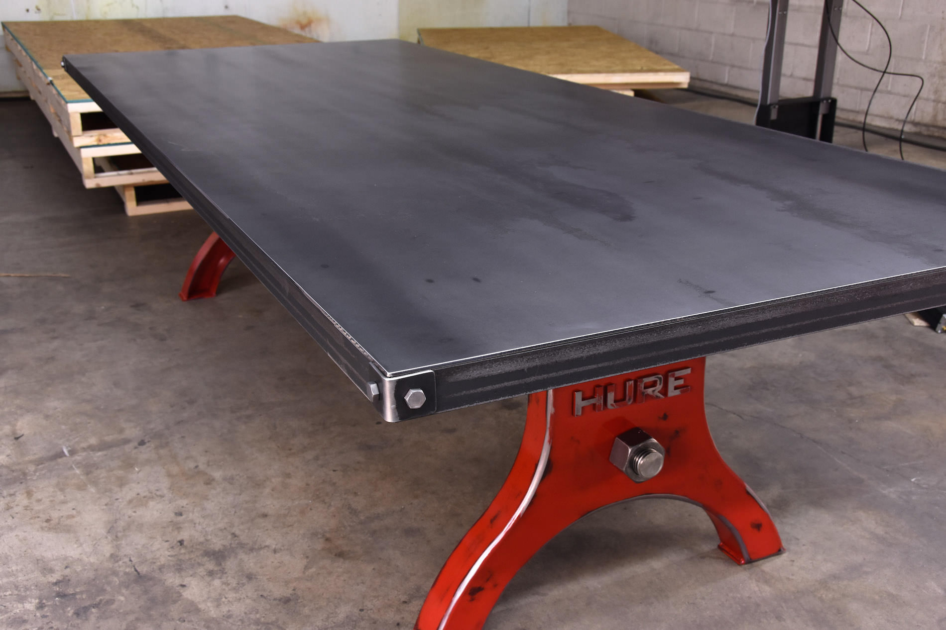 Hure table with an aged red base. It has a glossy clear coat as well as polishing underneath the red. The steel top has a natural finish on it.