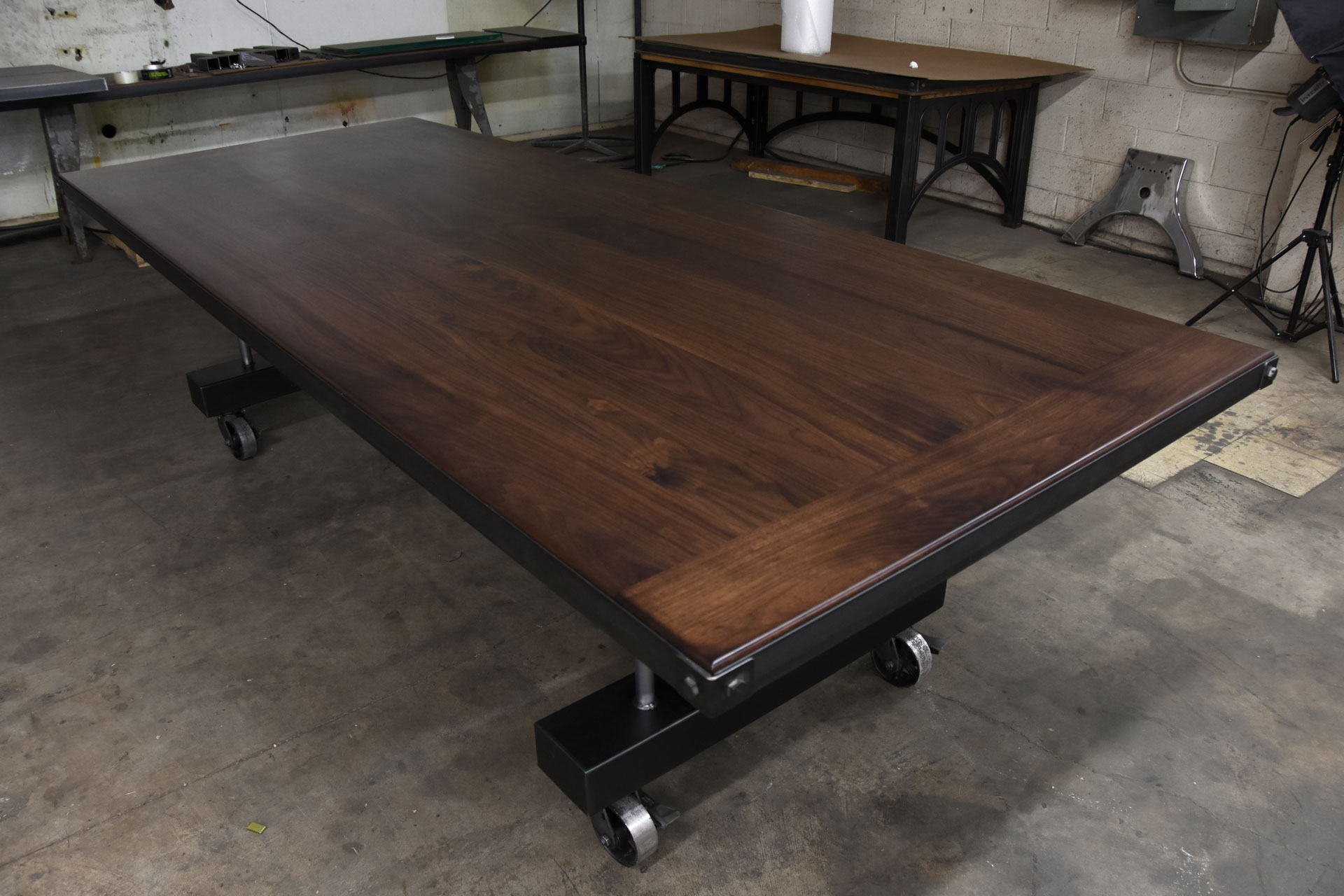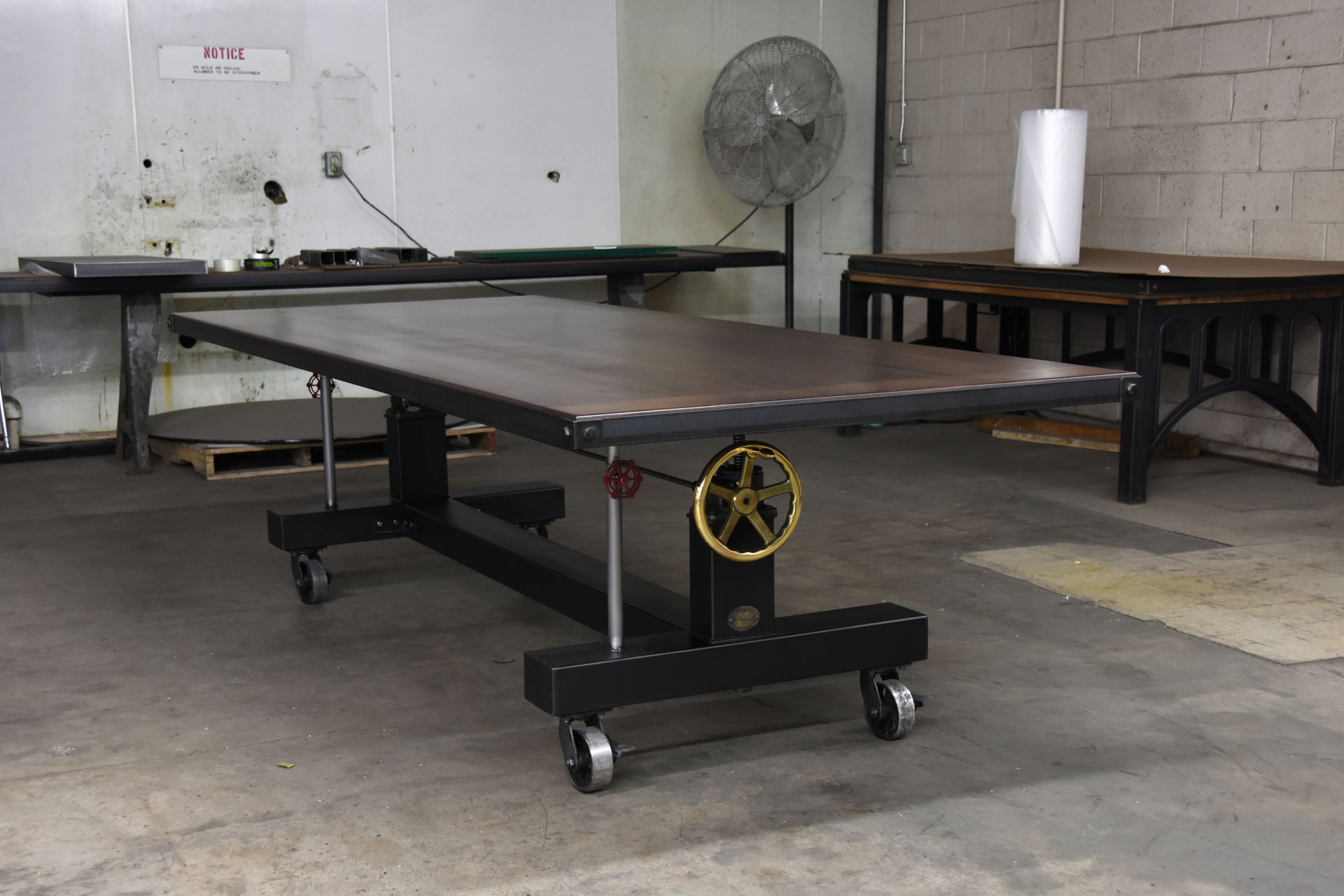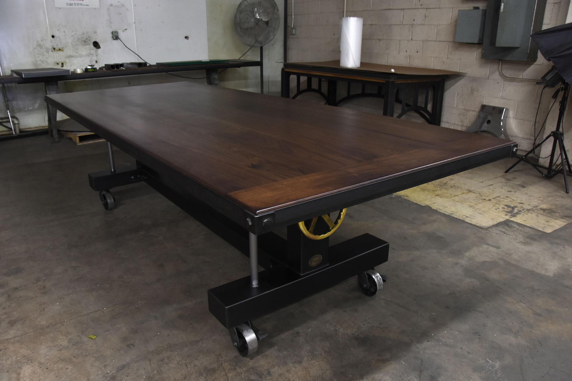 This Crank table features a thick walnut top with metal trim and bolted corners. The base sits on locking casters making it easy to move this heavy table around. The top height is adjustable via the brass crank handle giving it a sit or stand option. Having the ability to sit or stand in a meeting can drastically improve ones health, comfort and attention.
