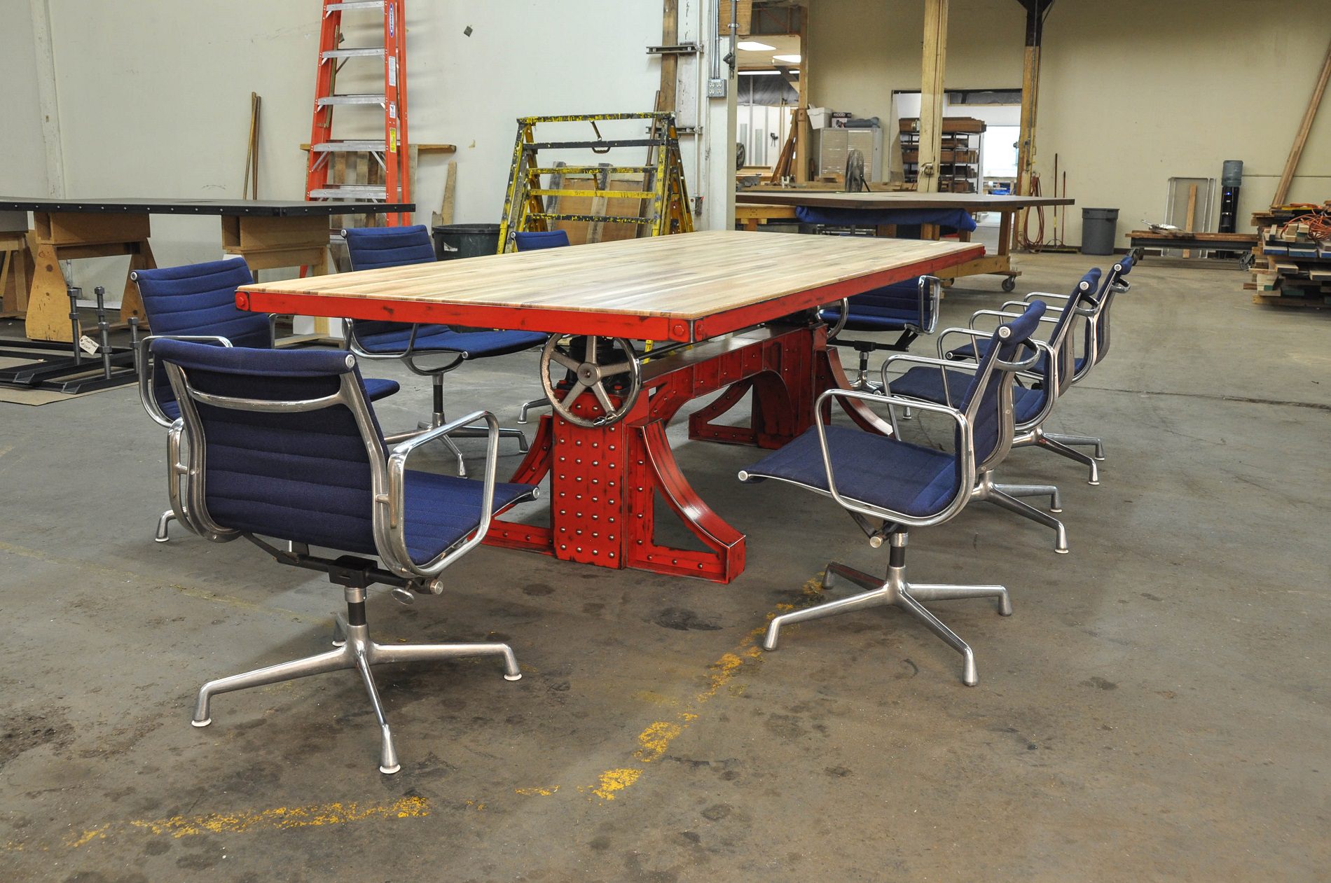 Bronx table with 10′ x 4′ natural stained reclaimed boxcar oak top