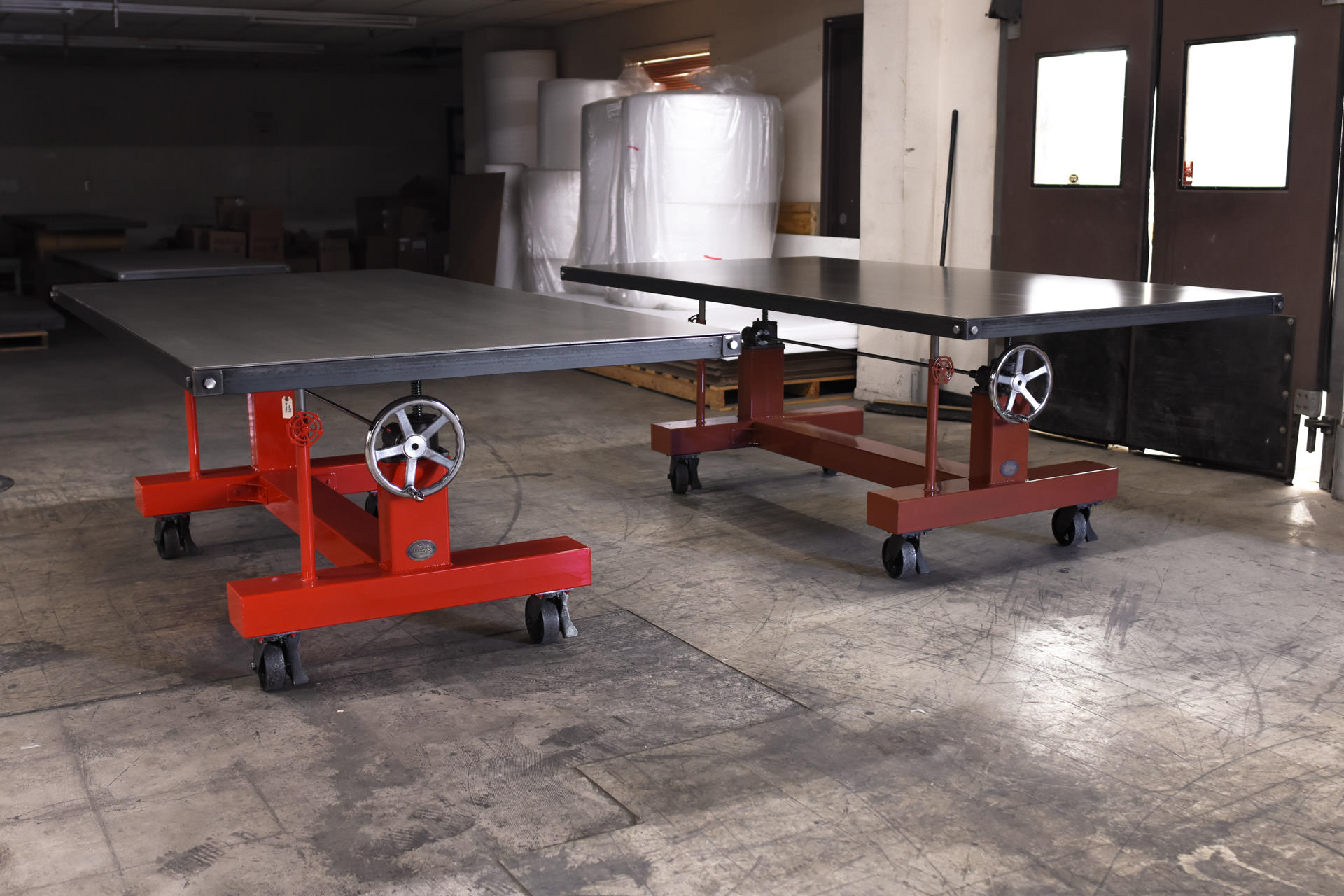 This Crank table has a custom powder coated finish called Copper Brown. It has a chocolate look to it. The base sits on locking casters making it easy to move around even though it weighs around 500 lbs. The top has a natural clear powder coated finish. The top adjusts up and down from 30″ to 42″ in height.