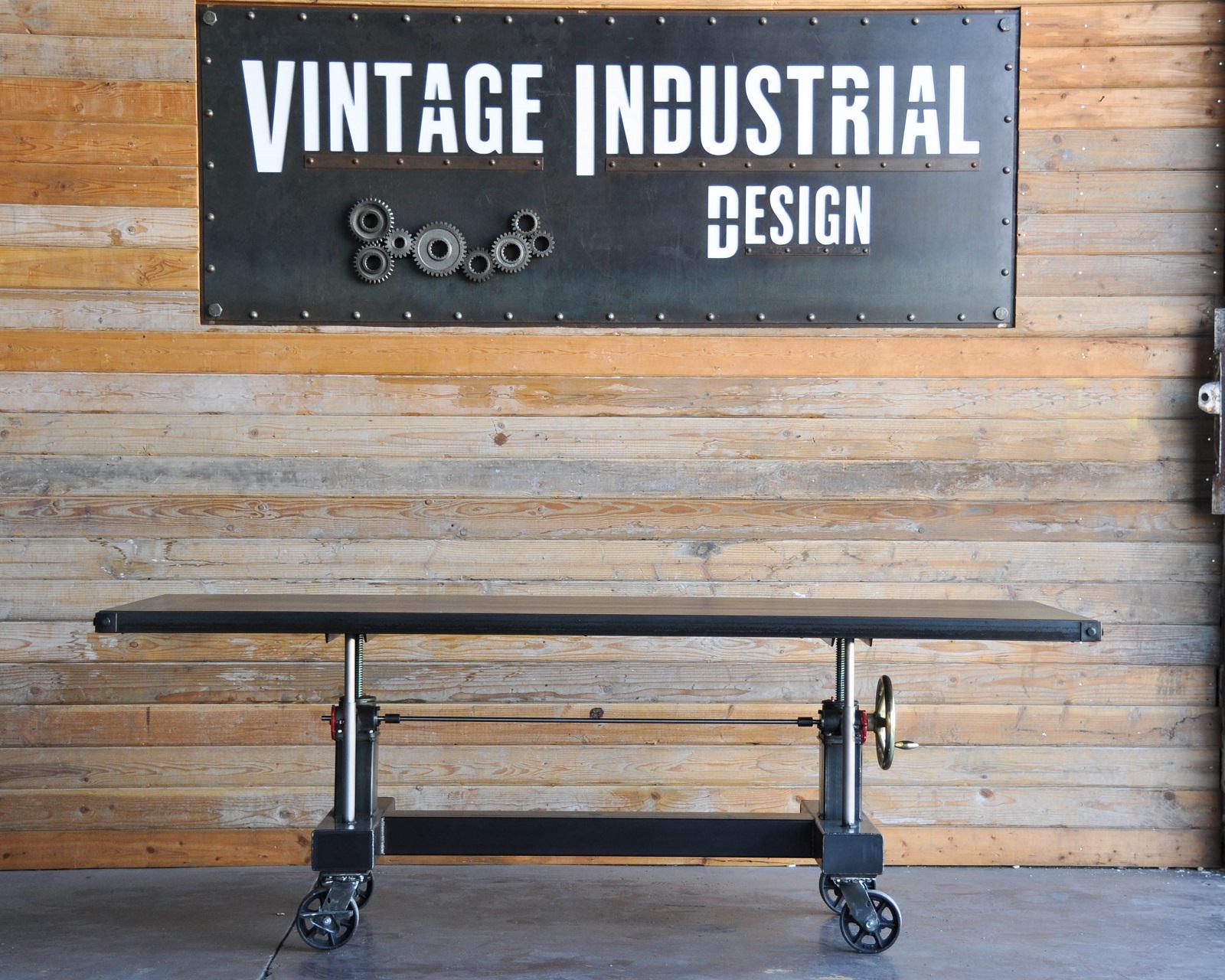 Crank table with brass handle, 96″ x 40″ walnut top on casters 96″ x 40″