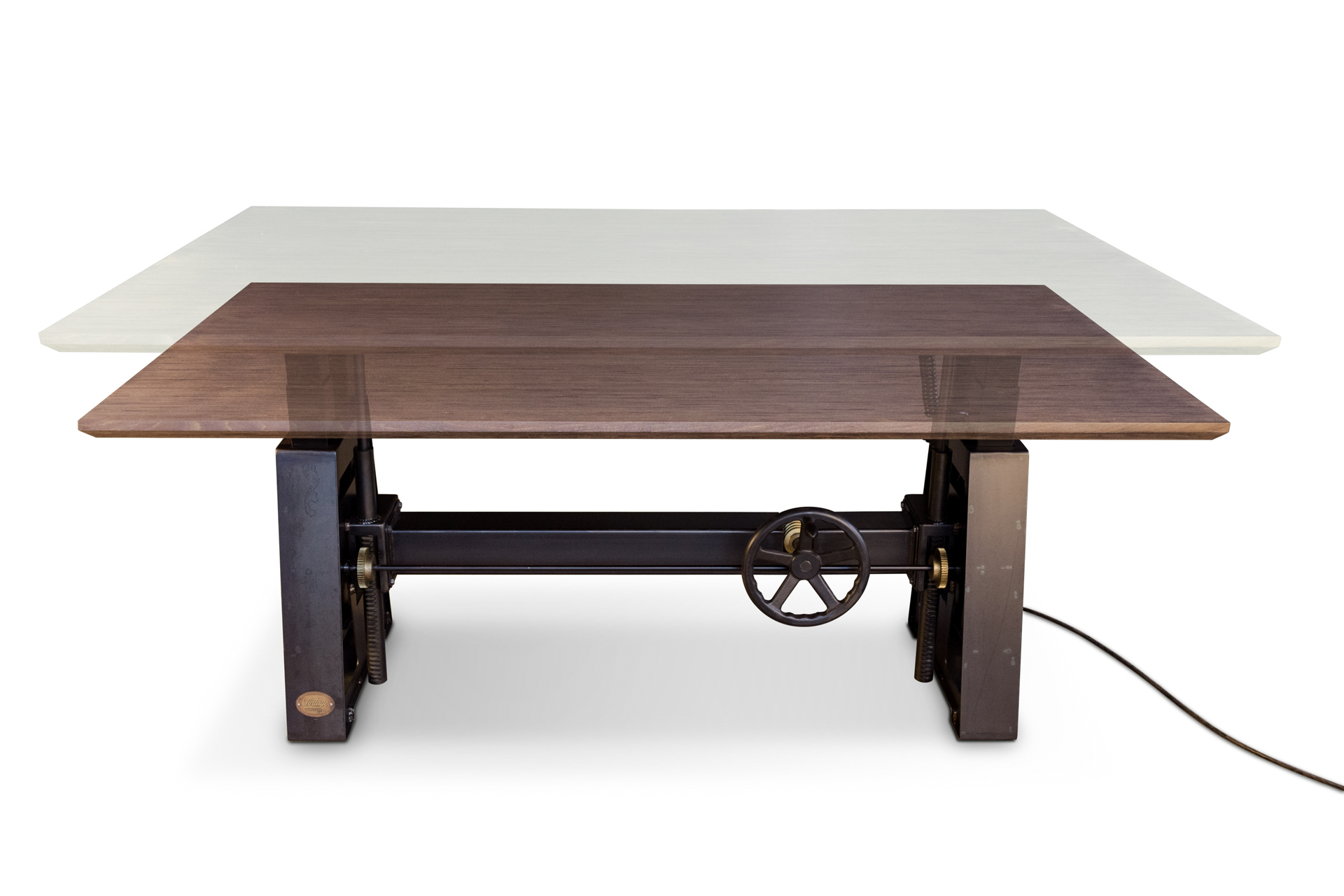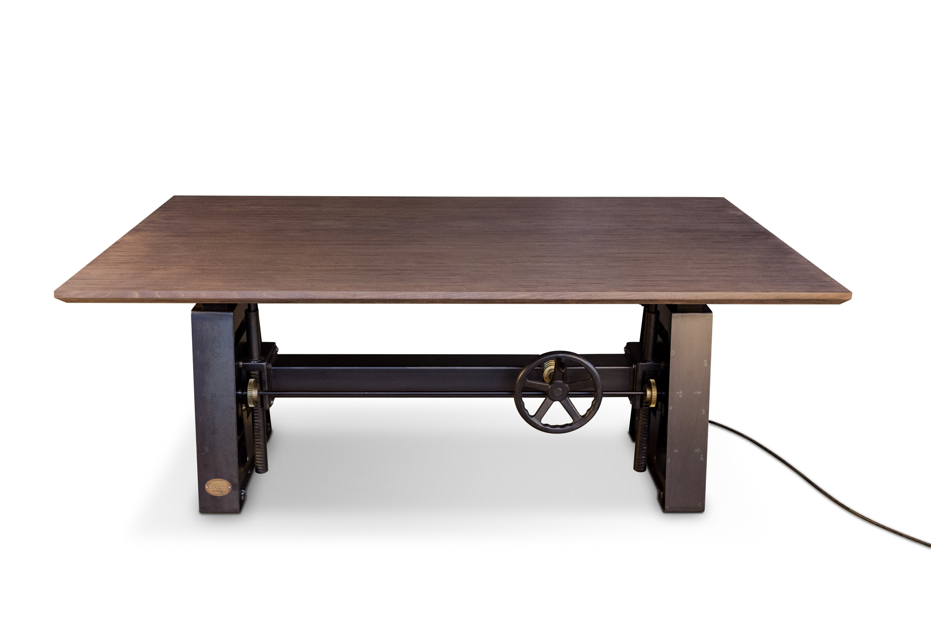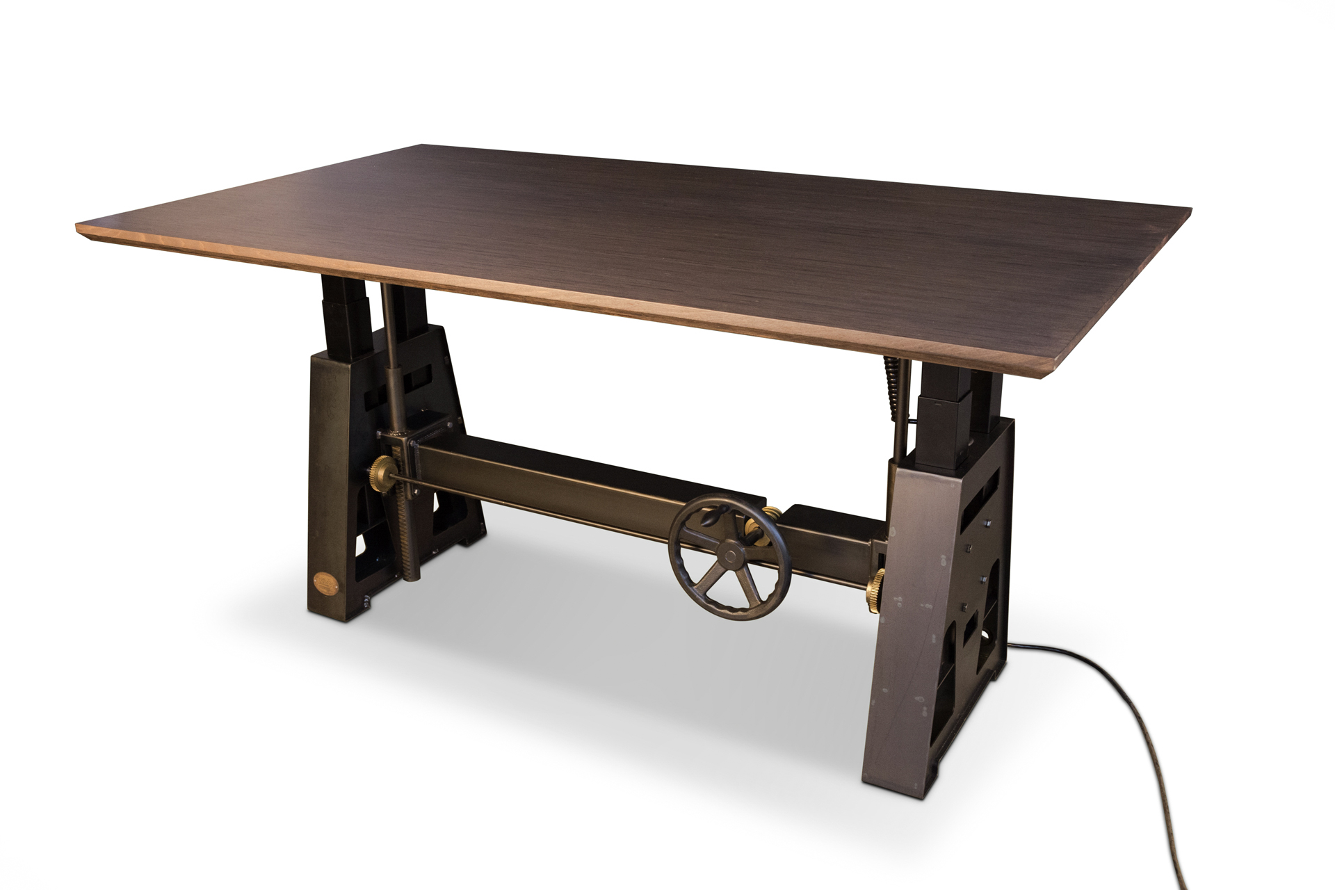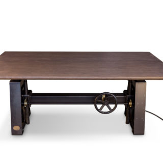 We had a client looking for an old world adjustable height desk, but with push button ease. It didn’t exist, so we designed this vintage style desk complete with gears, and added electric height adjustment. The four electric motors silently raise and lower the top from sitting to standing height. The gear and crank handle were added just for looks and are non-functional. This custom desk also has our new super durable beech ply top with a beach house gray stain.