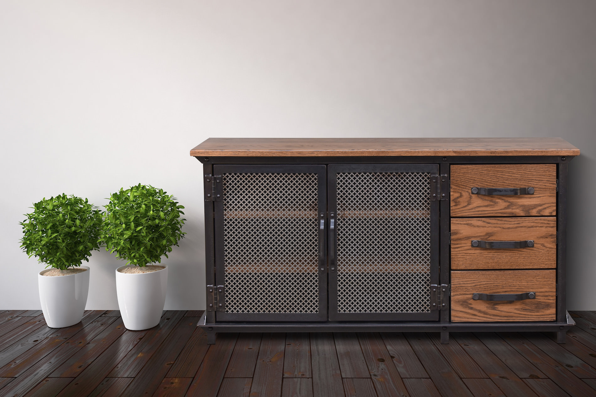Ellis Console with oak drawers, shelves and top. This item is available for sale here.
