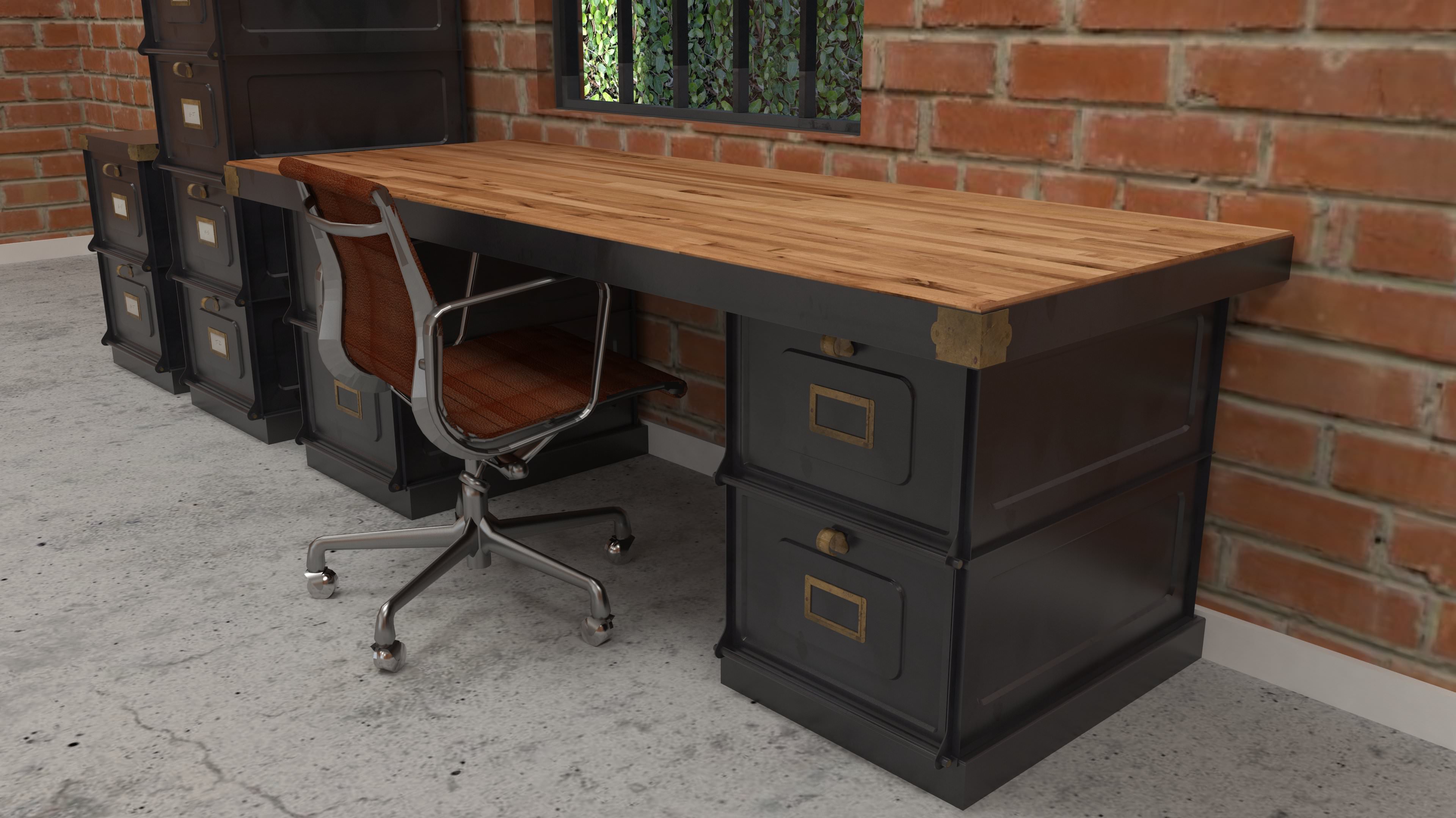 Influenced by turn of the century French design, the Forges desk is made of steel with brass accents. Shown with a reclaimed boxcar oak top, and a steel top. Also available with matching filing cabinets.