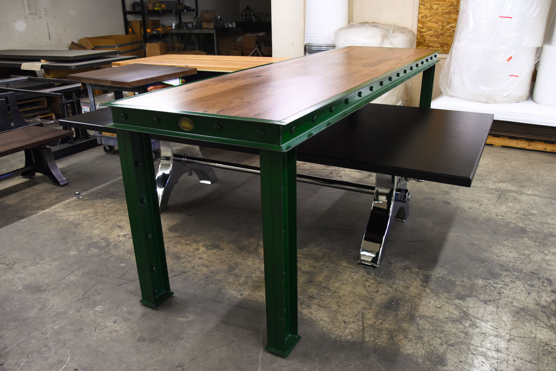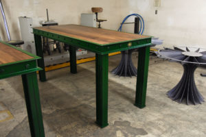 Our Firehouse design is the sturdiest table we make, built to survive the Trumpacolypse! This group of aged green tables have walnut tops with a natural stain. They are bar height (42″).