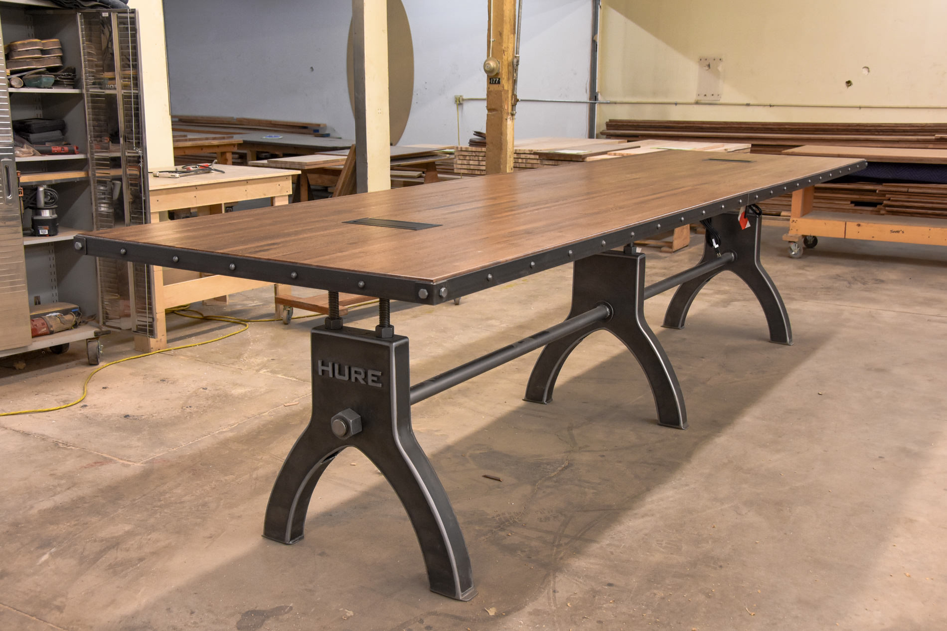 We took our Hure conference table and made it bar height. This 16′ long community table features 2 dataports in the reclaimed boxcar oak top, and has a riveted edge which offers a big layer of protection for the wood.