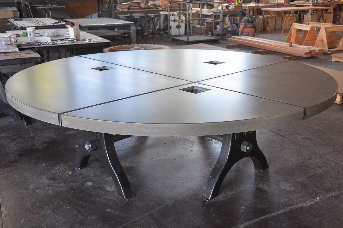 Hure Conference table with a 90″ round polished concrete top. The asymmetrical concrete top was built in 4 sections and included a few holes for data ports.