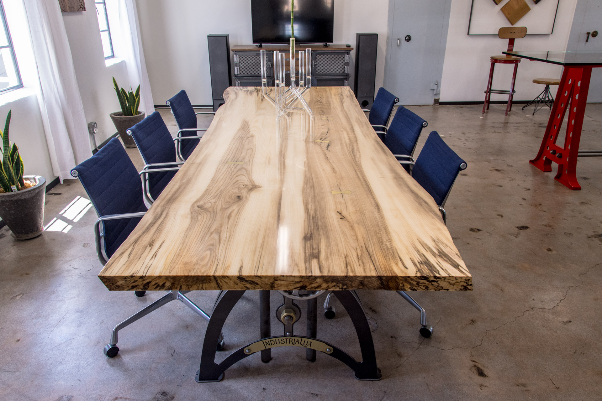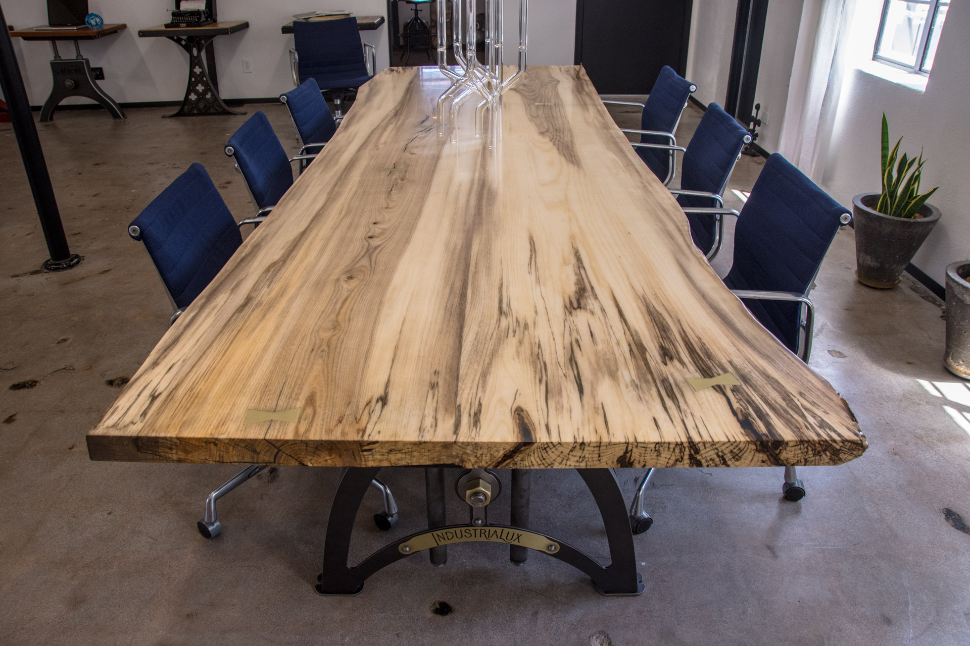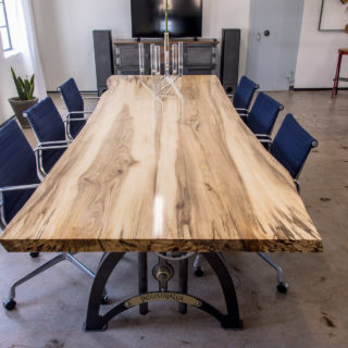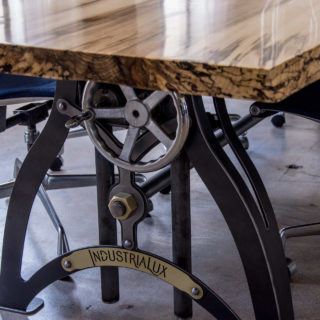 This IndustriaLux Crank table has a gorgeous Hackberry live edge top on it. The top has inlaid brass bow ties which are used to keep the top from splitting down the road. Hackberry has some very interesting grain and color, and we gave it a super durable epoxy coating making it pretty indestructible. Live edge tops can warp and twist over the years, and sealing it in epoxy can help circumvent that from happening. The Lux base is the crank version so it’ll adjust from 30″ to 42″ in height, making this a versatile sit stand conference or dining table.