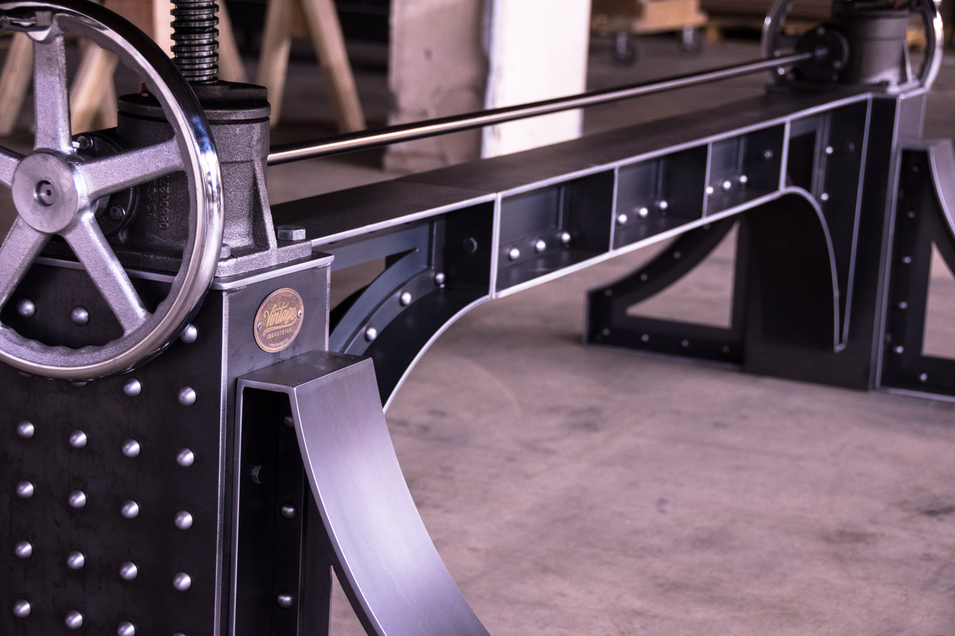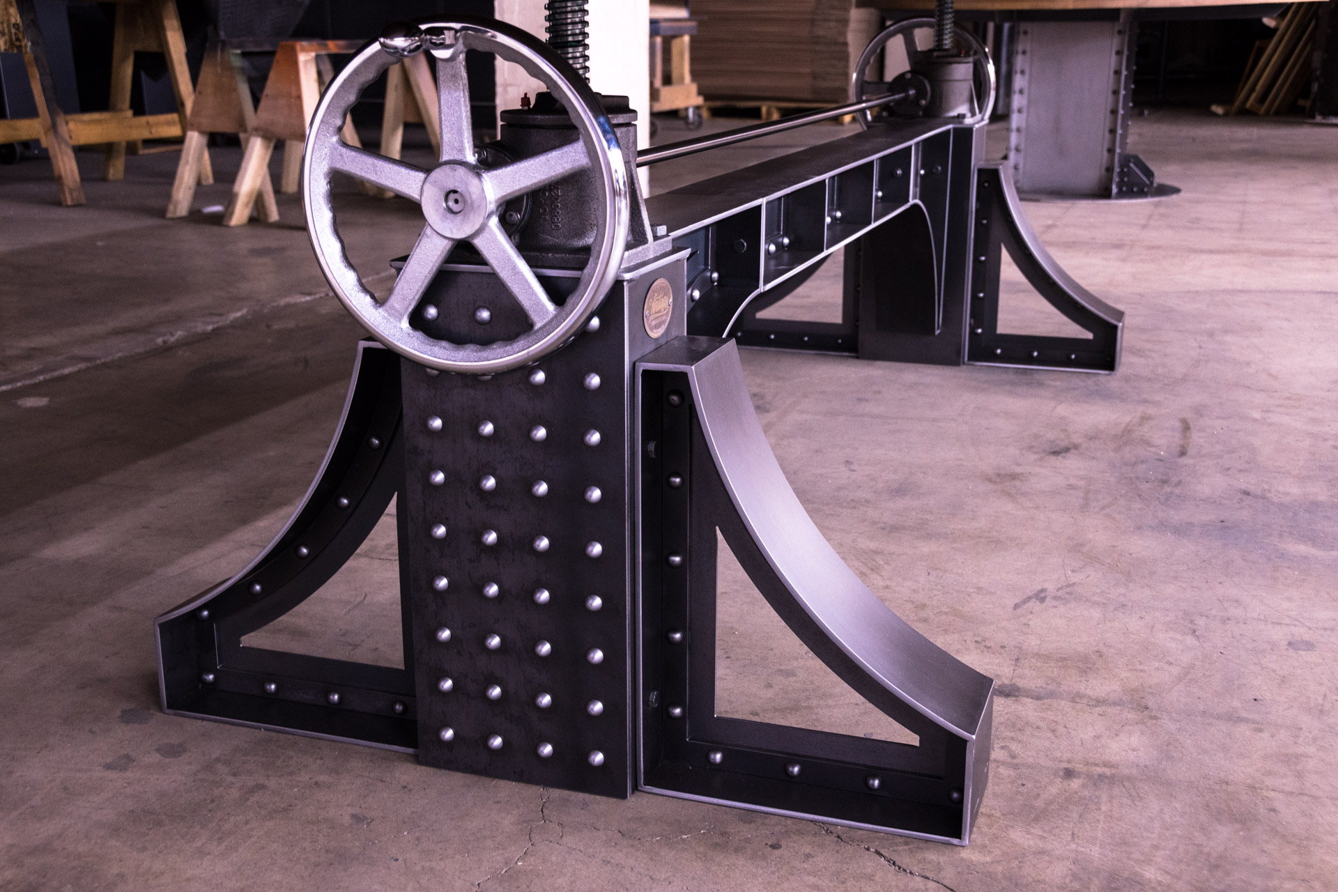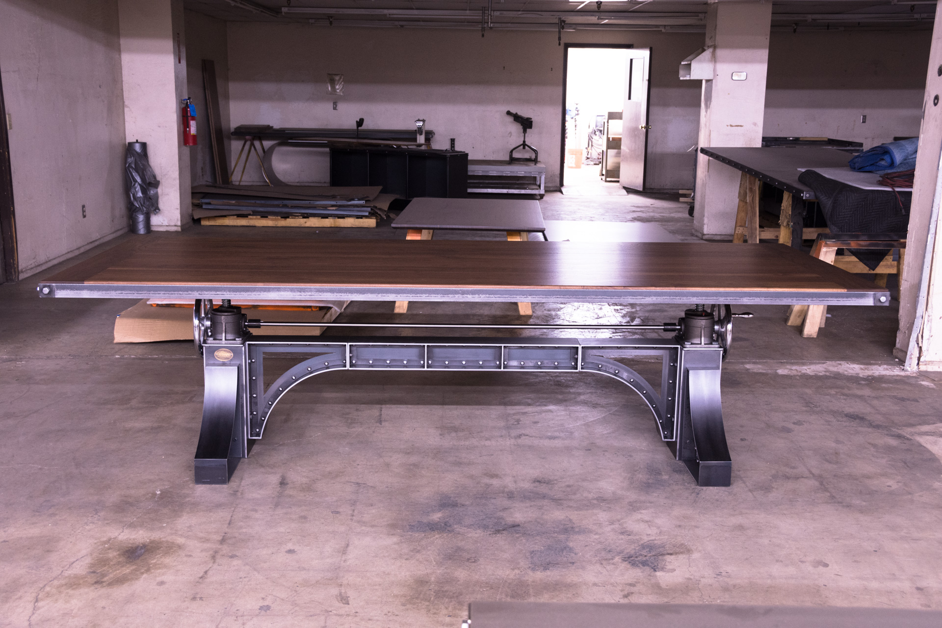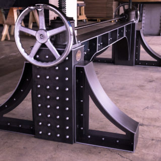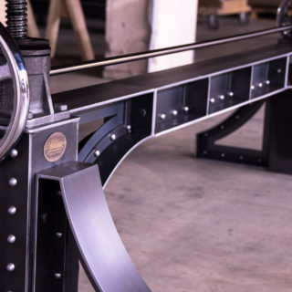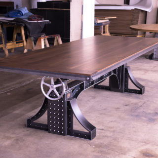 Sit stand desks are all the rage now. This however is a sit stand conference table. We pioneered crank tables using this special industrial mechanism 8 years ago, and have been refining them ever since. And the Bronx design makes for a spectacular sit stand conference table. Weighing in at 630 lbs, it features a natural steel finish on the base with over 200 time consuming rivets. The natural walnut top adjusts up and down from 30″ to 42″ and has our standard metal trim with bolted corners. That not only helps tie in the base to the top design wise, but it also protects the edges and corners from impacts from chairs and what not. The walnut top was constructed with bread boards on the ends which help stabilize the top and keep it from warping or bowing down the road.