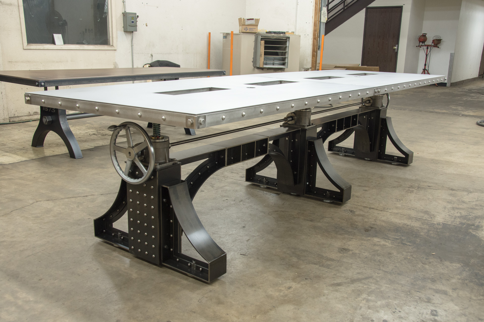 This custom Bronx table was designed and built to be used on a rooftop terrace in NYC. Many considerations were taken to ensure longevity outside including: marine grade screw mechanisms, stainless steel top and hardware, powder coated components and base, & levelers to keep it off the ground water / snow. This piece has a natural finish on the top & base, and adjusts in height from 30″ to 42″. The top also has 4 troughs inset for iced drinks or plants, and they have drain plugs underneath. And it has 2 holes to hold for umbrellas.