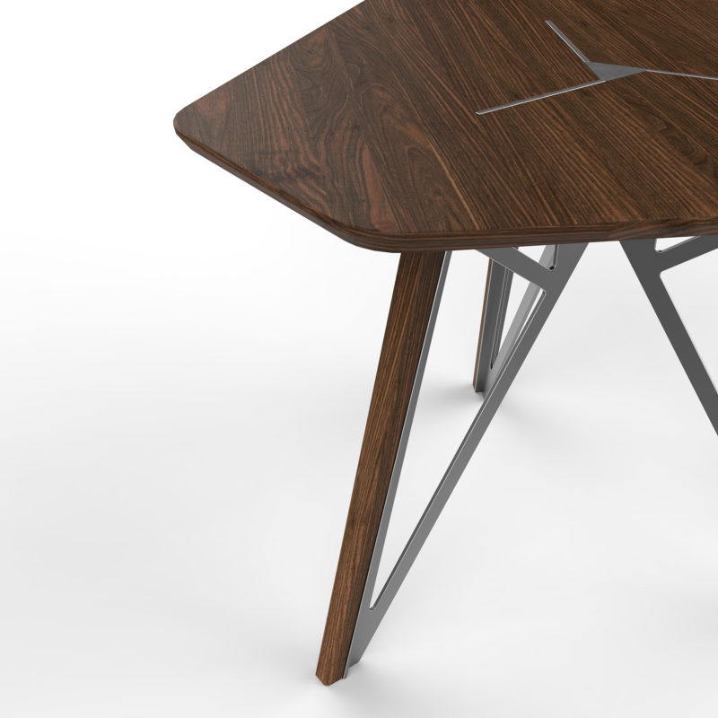 Our industrial referenced version features interwoven natural steel and walnut hardwood that creates a bespoke layered effect. Oppose to the tradition tabletop layout, the refined three beveled sides also make an elegant appearance to seat three. The alluringly designed table is striking on its own, yet adaptable in an arrangement. It pairs perfectly in multiple groupings, giving it an intriguing touch of individuality.