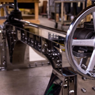 The dual crank wheels are chrome plated and are used to raise and lower the top from 30″ to 42″, making this a sit stand desk, or a dining to bar height table. The adjustment makes the table more much versatile, and we’ve had clients use these for kitchen islands too since they also hit counter height. The mechanisms that raise and lower the top are rated to 5 tons each, and are meant for 24/7 industrial use, so they’ll definitely hold up over time, and are serviceable with Zerk fittings.