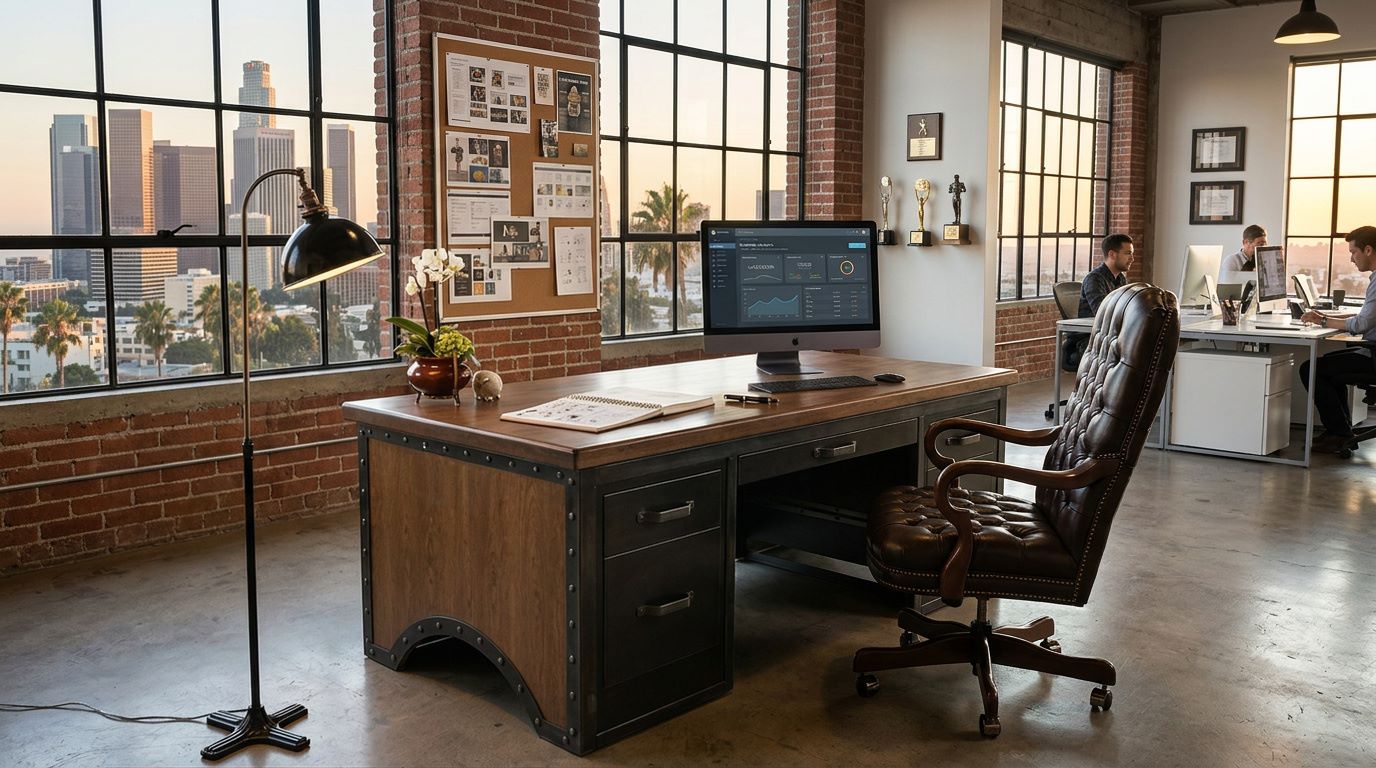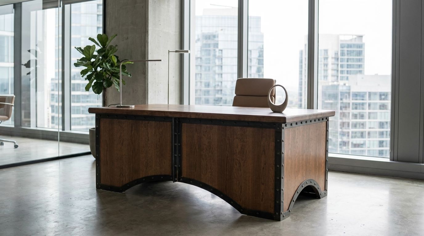 The Chairman Desk has a more traditional style infusing industrial elements. It has 5 drawers, 2 for filing, and is ready for everyday use. Handmade in our Phoenix shop, and available in just about any configuration or finish.