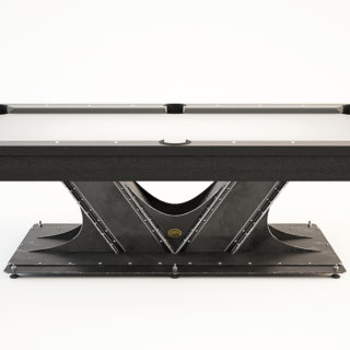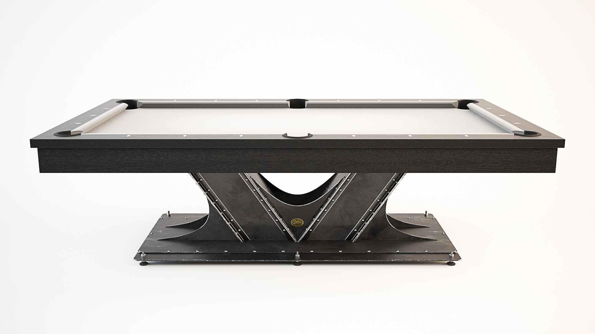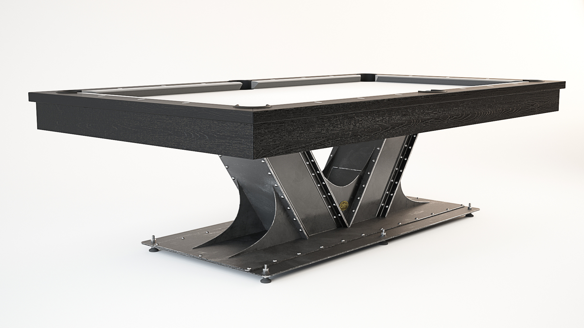Here’s another pool table we’re in the process of developing. We adjusted the scale our of popular VI Beam base to fit the standard 4′ x 8′ pool table top. The finish of the wood and felt on the pool table can be customized to your liking. And metal trim around the wood can be added to tie in the base to the top more.
