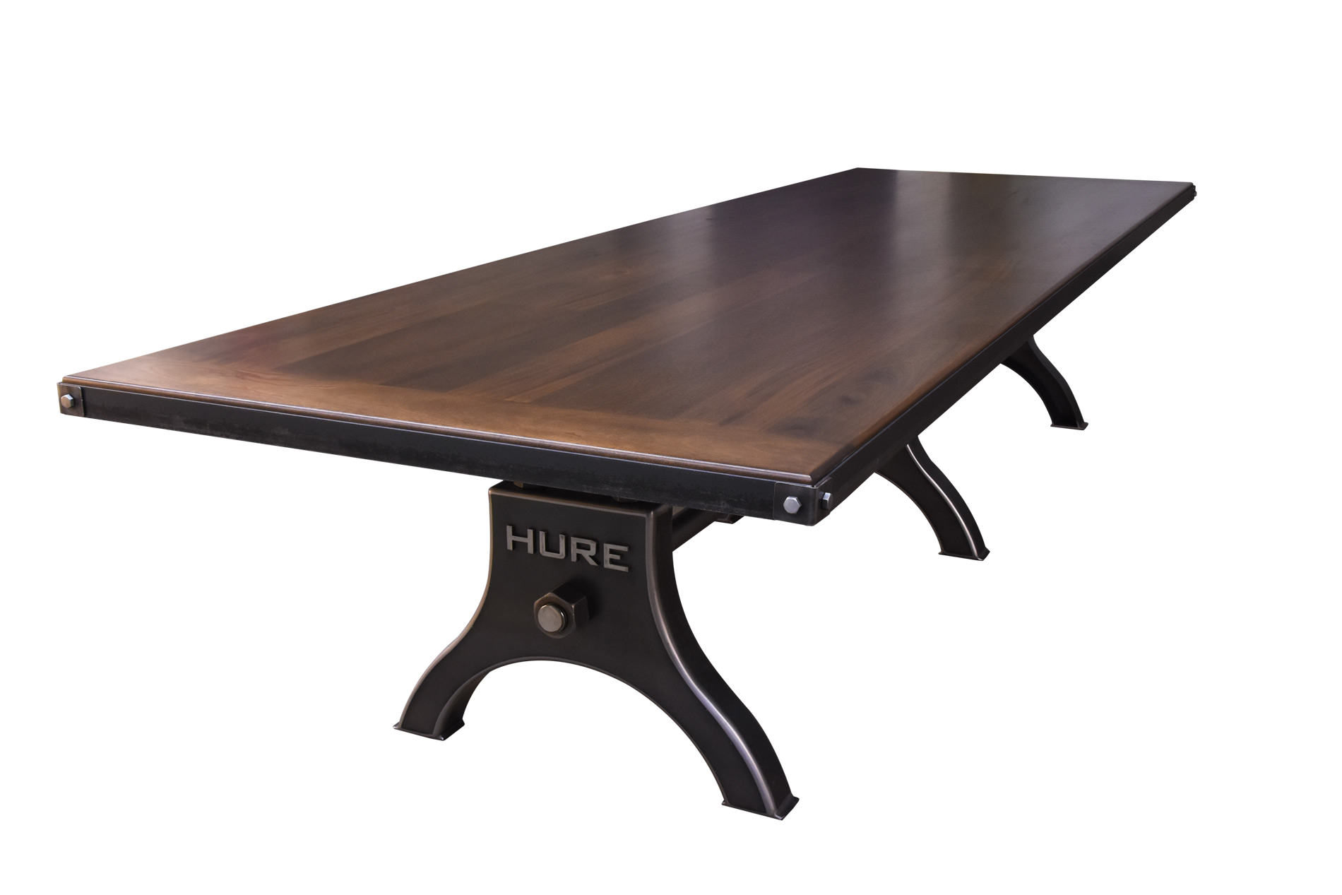 Hure Conference table with a 16′ walnut top and bolted corners. We used 3 bases to support this large table. The center base is double sided to preserve the symmetry.