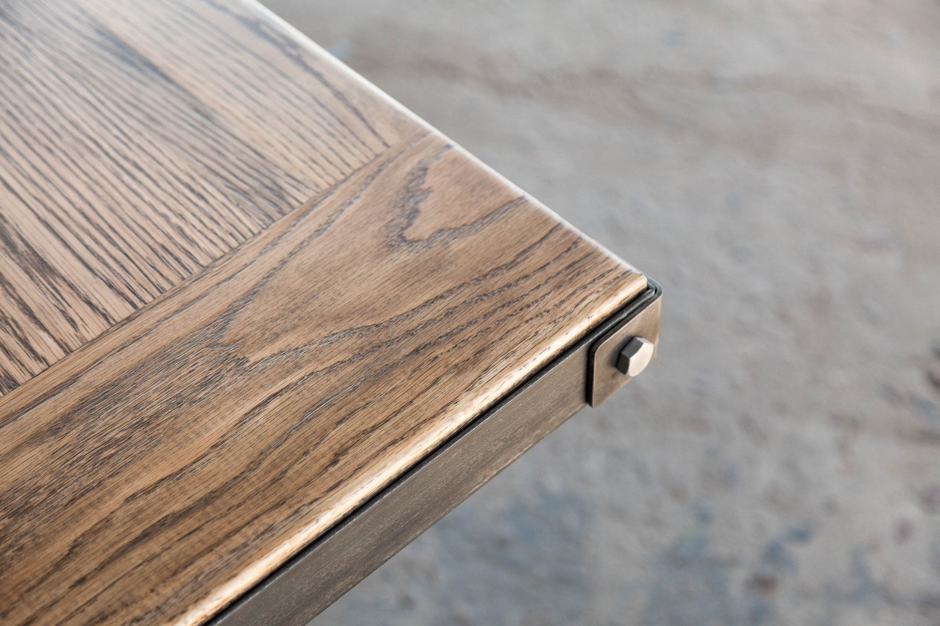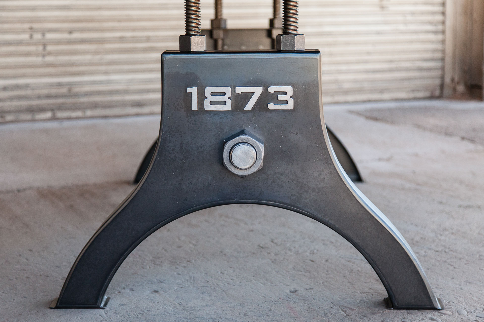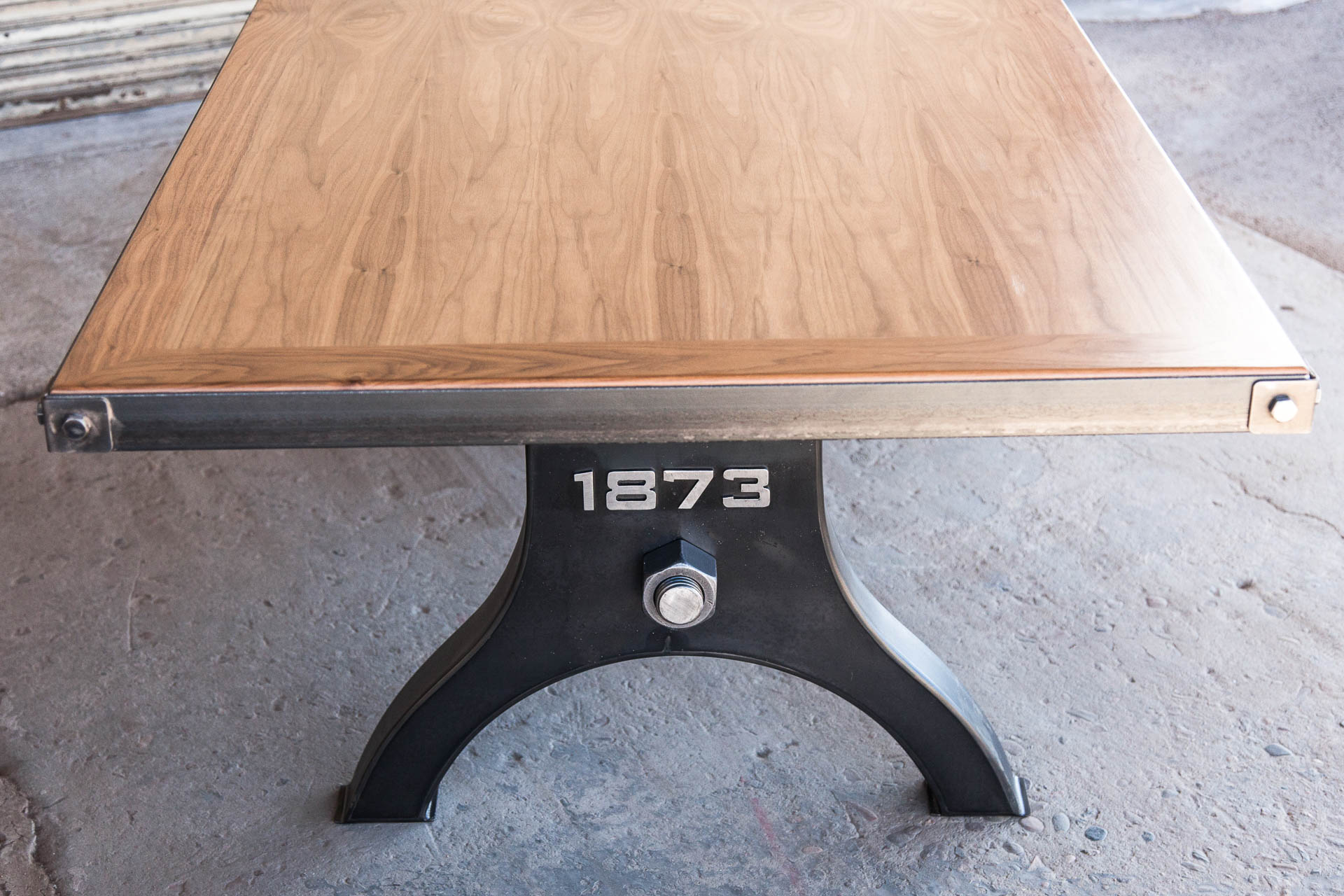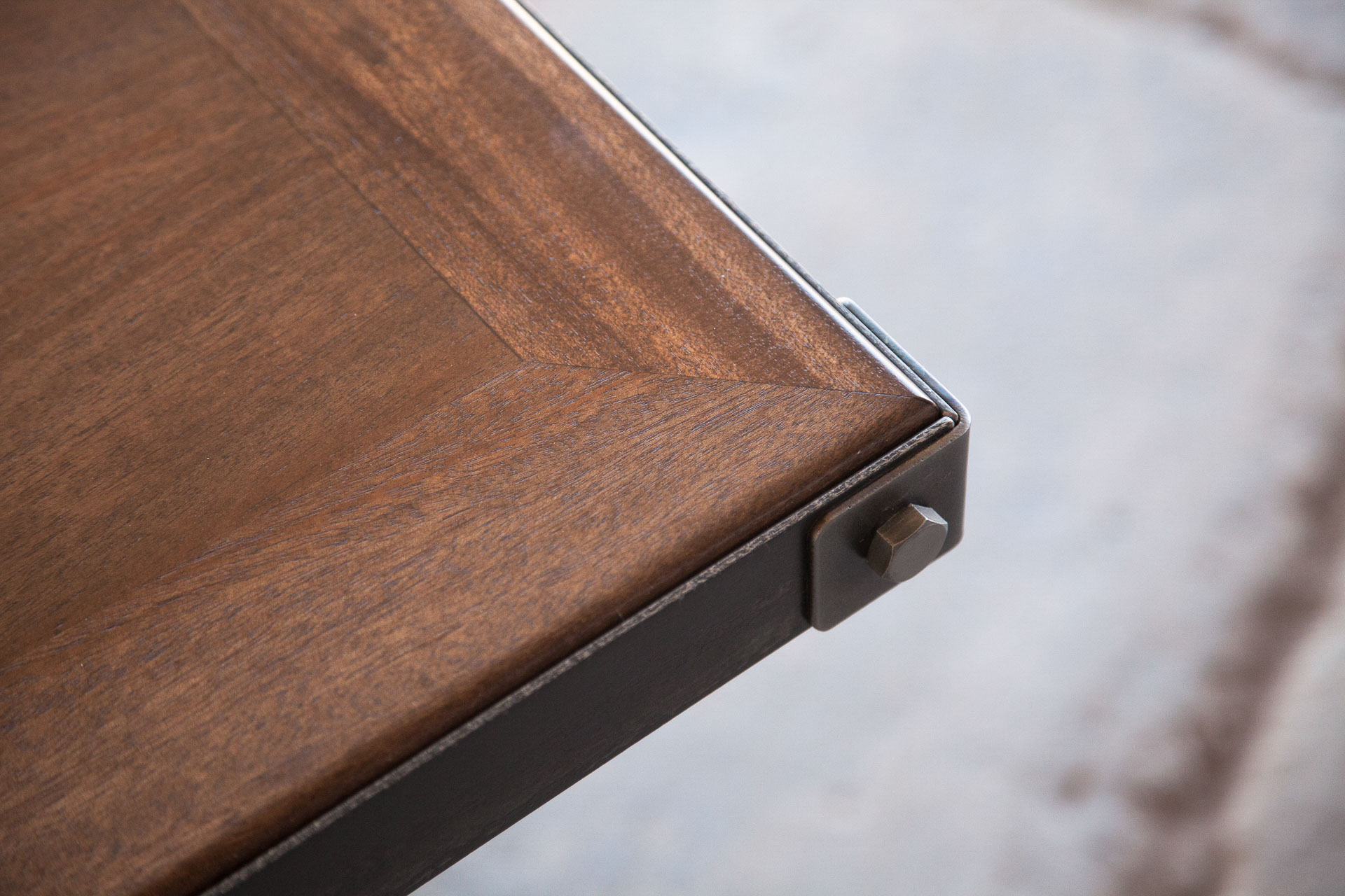 The steel base comes in an artisanal natural matte finish that includes a large 2″ diameter connecting rod with a 3″ nut to support the construction of the rod & bases. Our tabletops are crafted by hand in plywood veneer with a hardwood edge and you can select from three different high-end veneer wood species: walnut, oak, and mahogany.