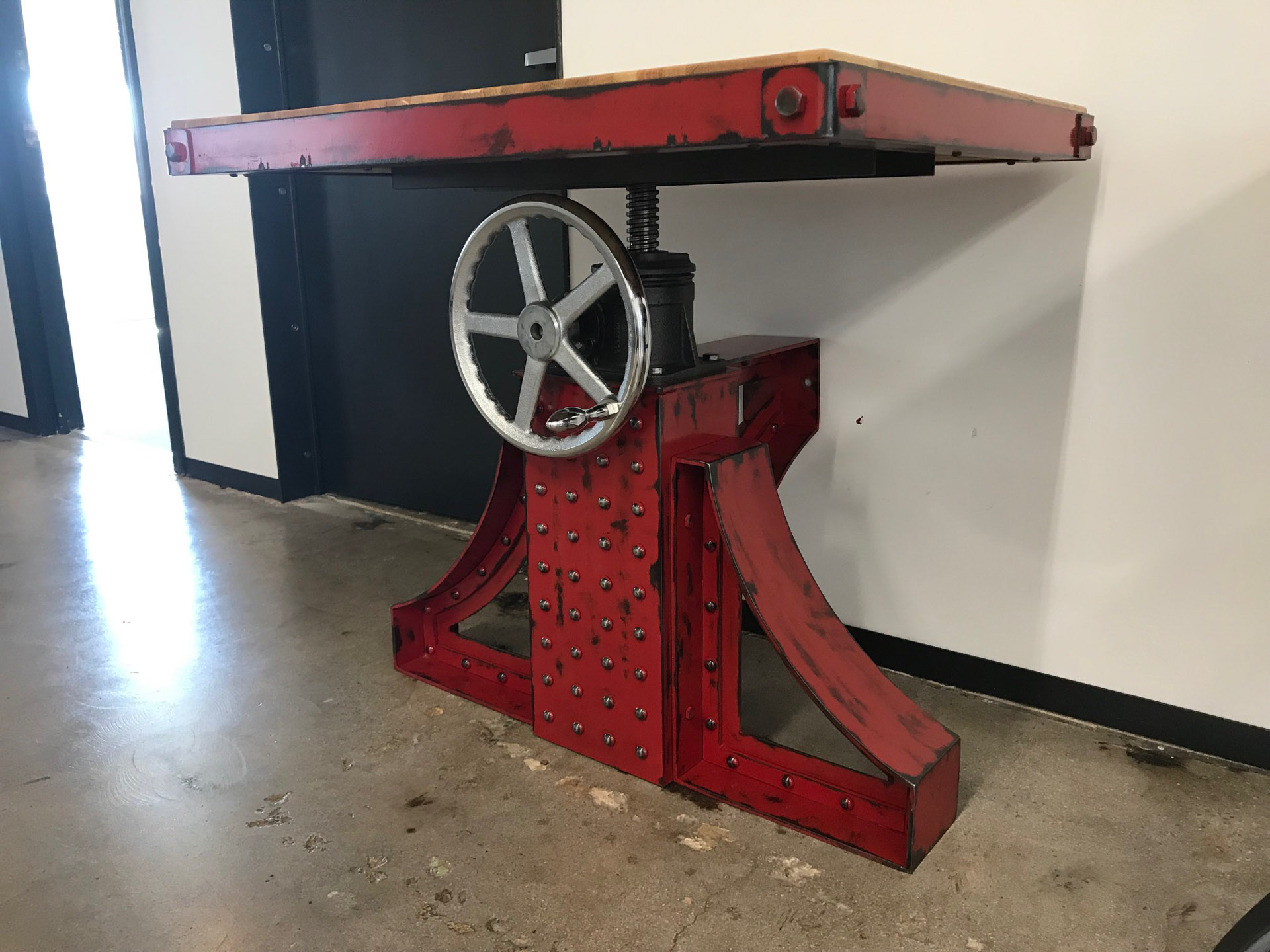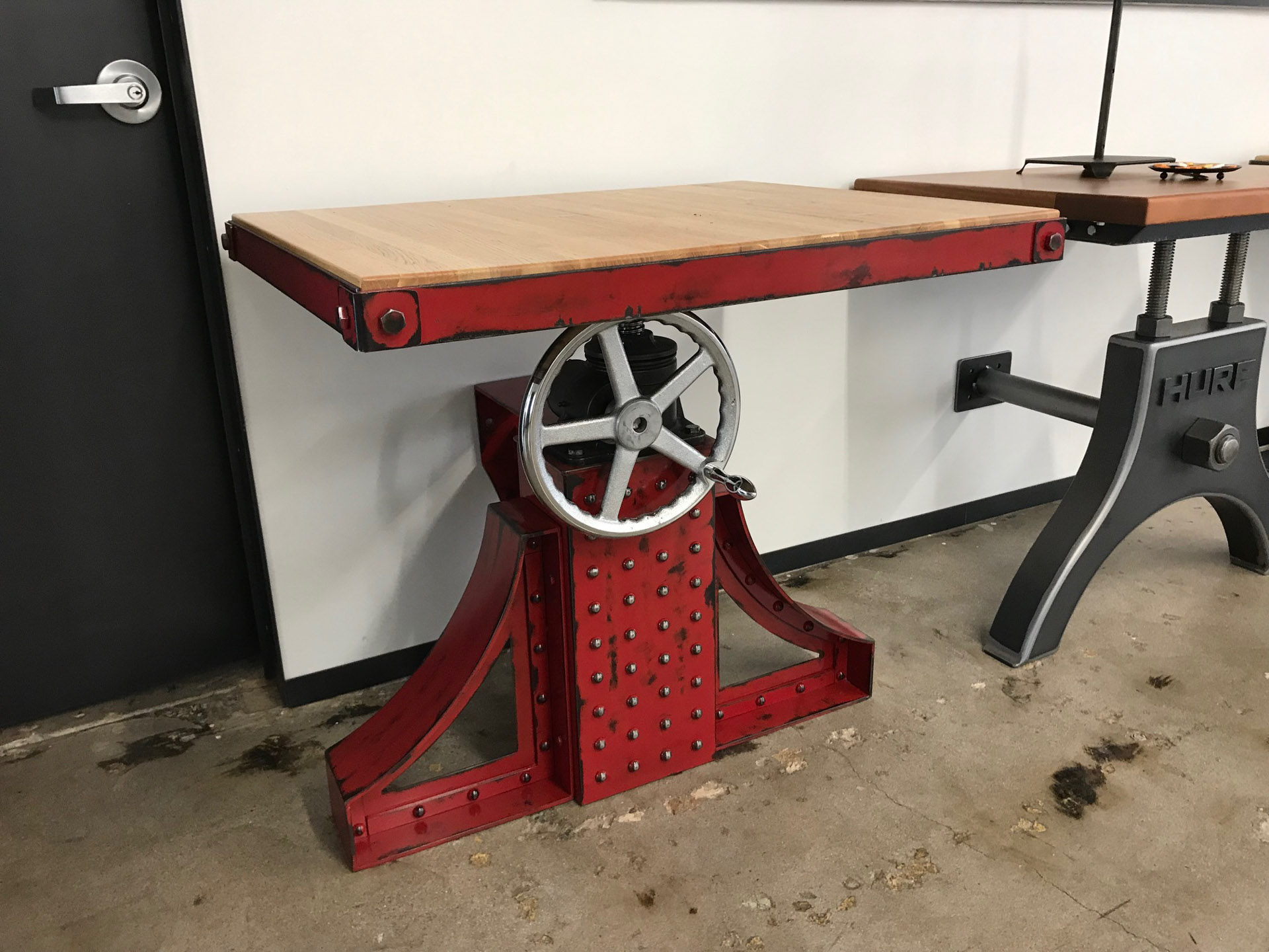 We made this as a demo table for a trade show. It’s a functioning Bronx crank table built to lean up against or be bolted to a wall. This one of a kind piece would make a killer side table. The top is made from our reclaimed boxcar oak, and the base has a red aged finish. Priced at around half price.