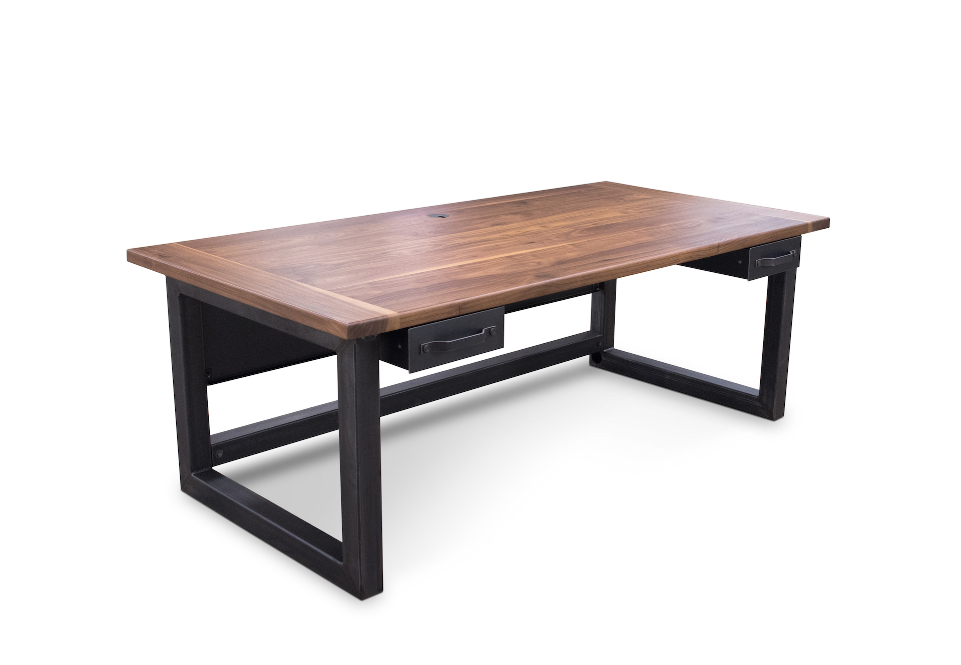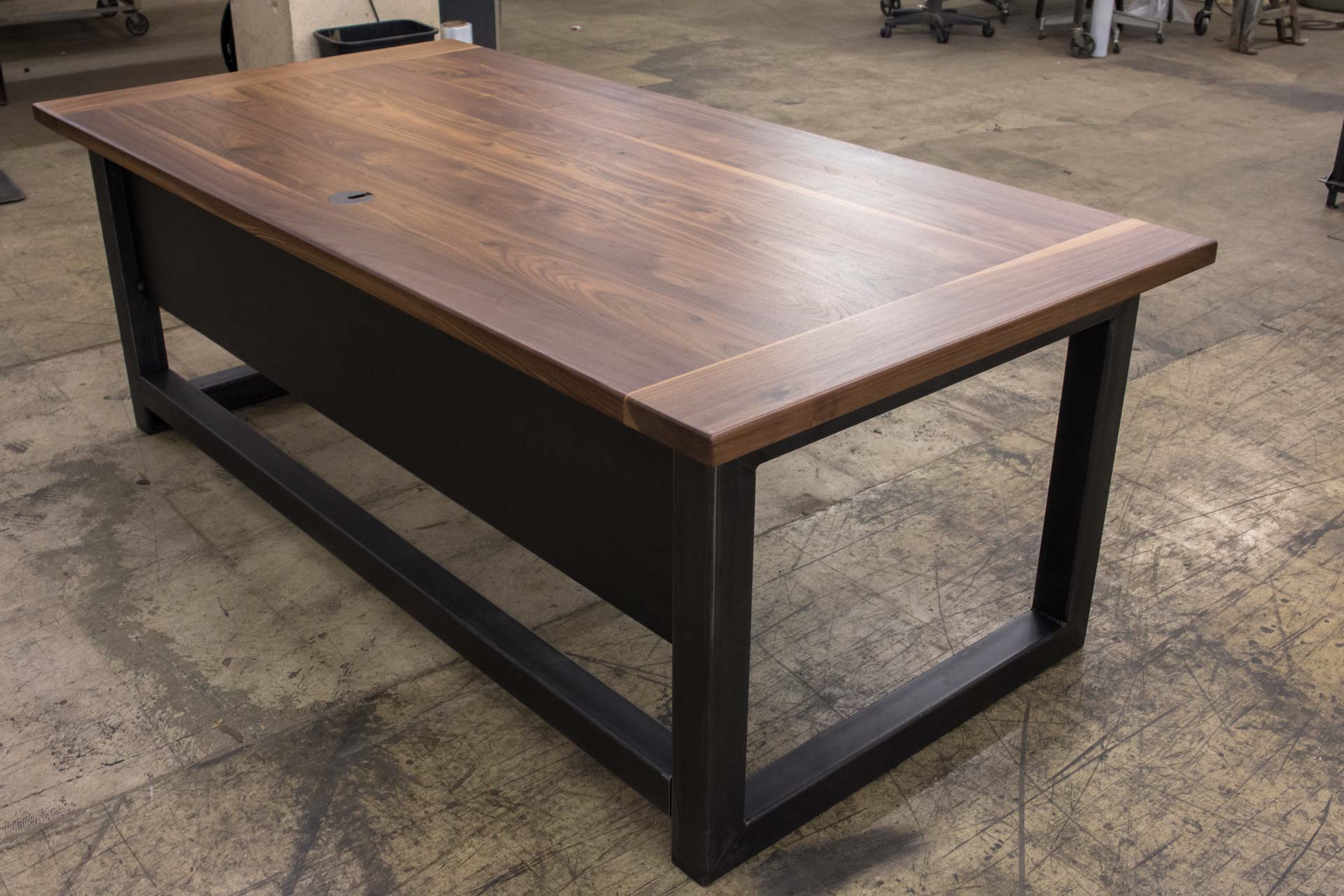 We took a different approach and made a simple desk that functions very well. The steel tubing and walnut top make it extremely durable and it’s built to last a few lifetimes. The top has a handmade grommet for computer wiring, and the legs have holes for routing cables.
