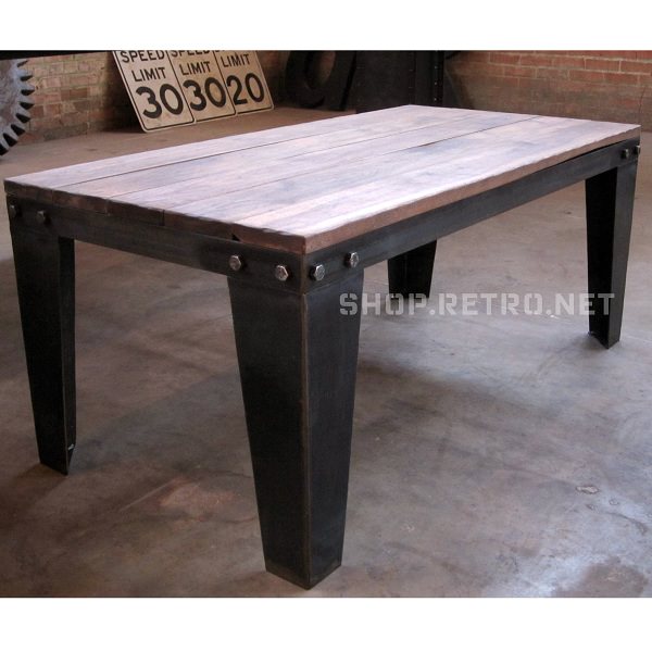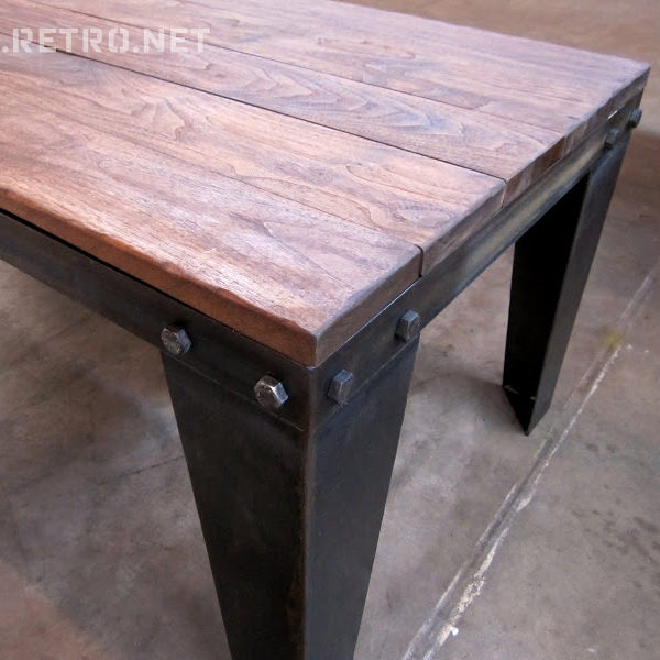 Handmade steel and hardwood coffee table with bolted corner accents.