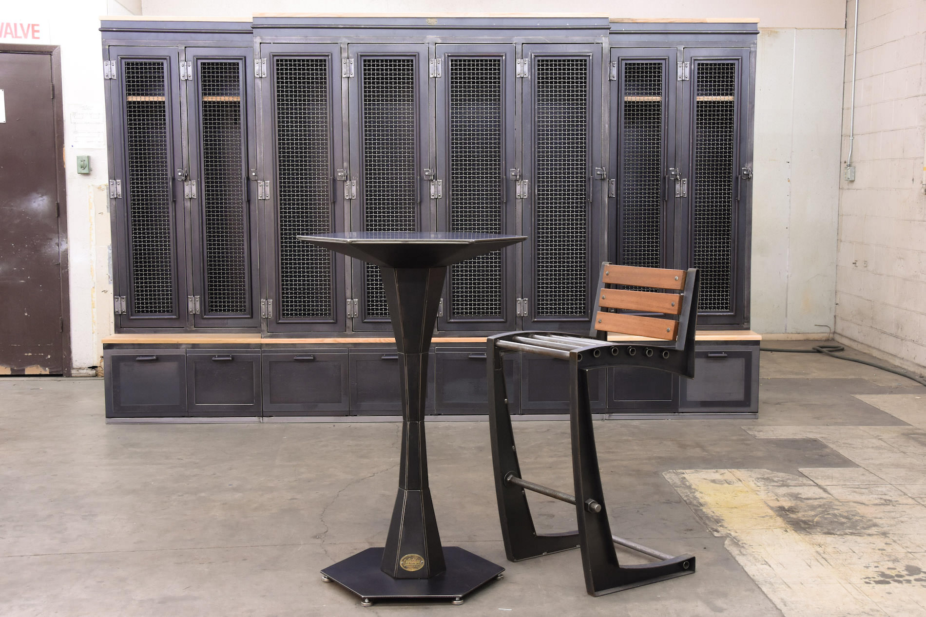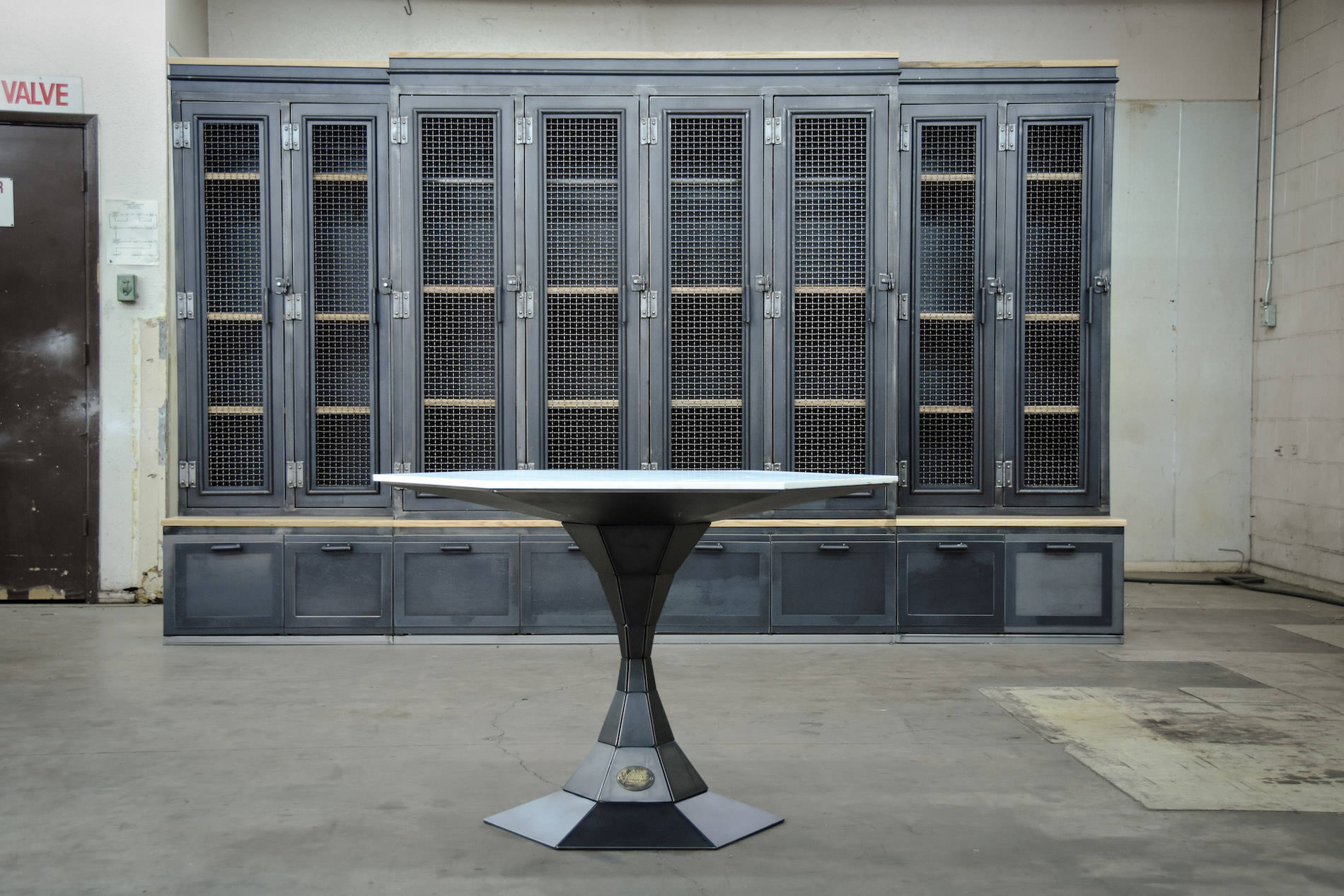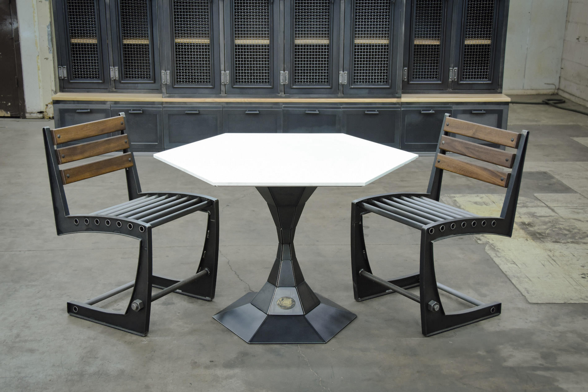 Vintage industrial meets modern, the Geo table is made up of 6 steel plates per section to form a hexagon. It is available in dining and bar height, with various top surfaces.