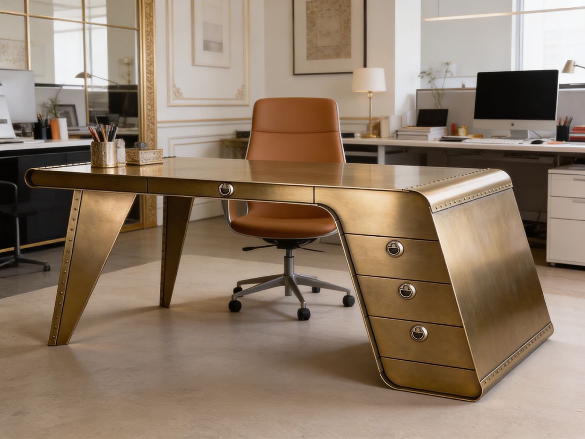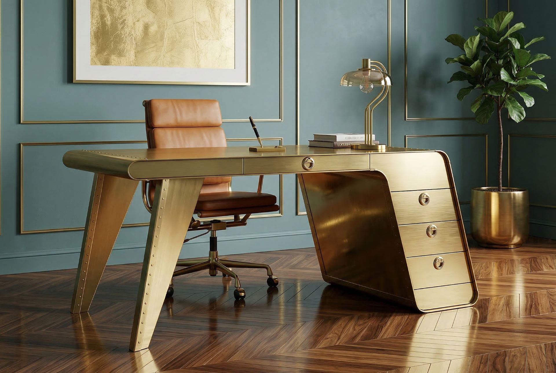 The desk is available in a brushed Cold Rolled Steel finish for an industrial look or a polished Brass finish for a premium, high-end feel. If you have another idea, let us know?