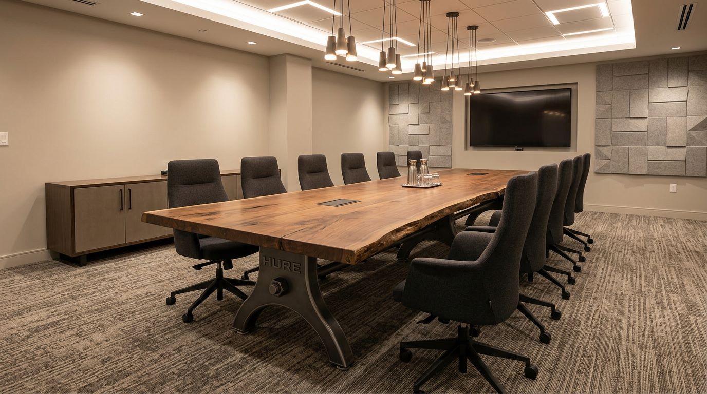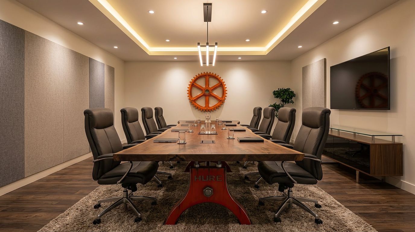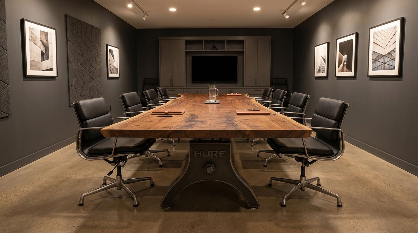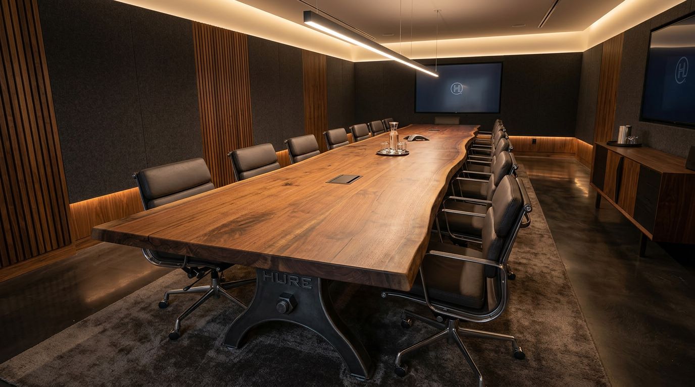 Hure Conference Table, Industrial Boardroom Table, Custom Walnut Conference Table, Machine Base Office Furniture, Large Scale Executive Table, 20 Foot Conference Table, Luxury Office Design, Bespoke Boardroom Furniture, Steel and Wood Meeting Table, High-End Office Sourcing, Interior Design Trade Table, Industrial Chic Boardroom, Data Integrated Conference Table, Architectural Statement Furniture.