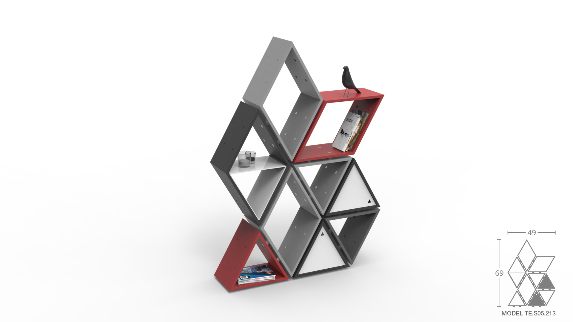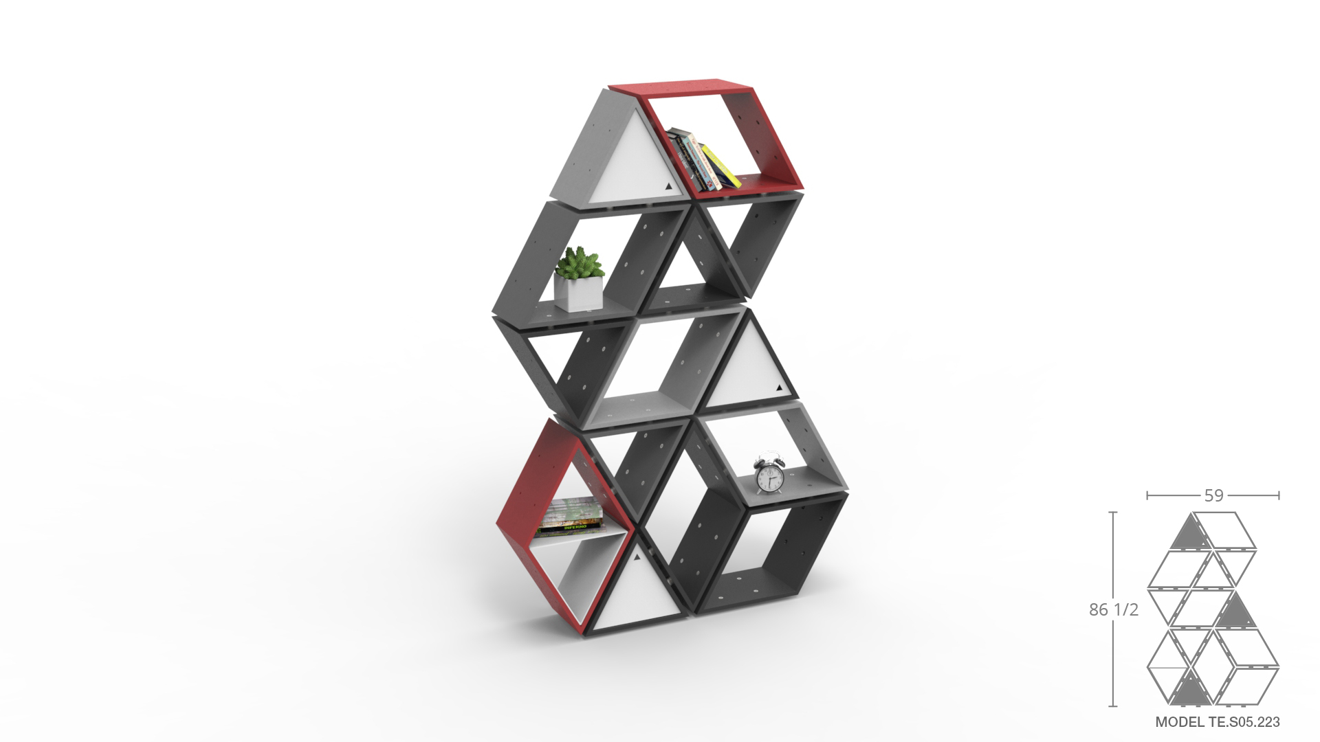 The shelves are composed of durable European Valchromat® product including 4 colors to choose from: light grey, grey, red, and black. For a natural variation, select plywood veneer in walnut or white oak with aluminum banding to create warmth in a room. The Tetra modular system pairs beautifully in plywood with aluminum banding enhancing the modern industrial aesthetic.