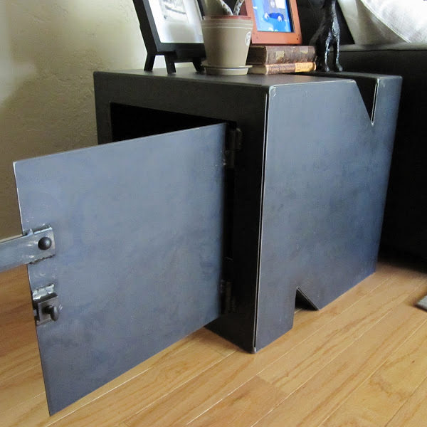 Part of my I Love NY series. These tables are 20 ” x 20″ x 20″ and have lots of storage inside. It is made of heavy gauge steel and weighs 120 lbs. A lock can be added to make this a cool safe. These pieces can be separate as side tables, or put them together to make a coffee table and show your love of NY!
