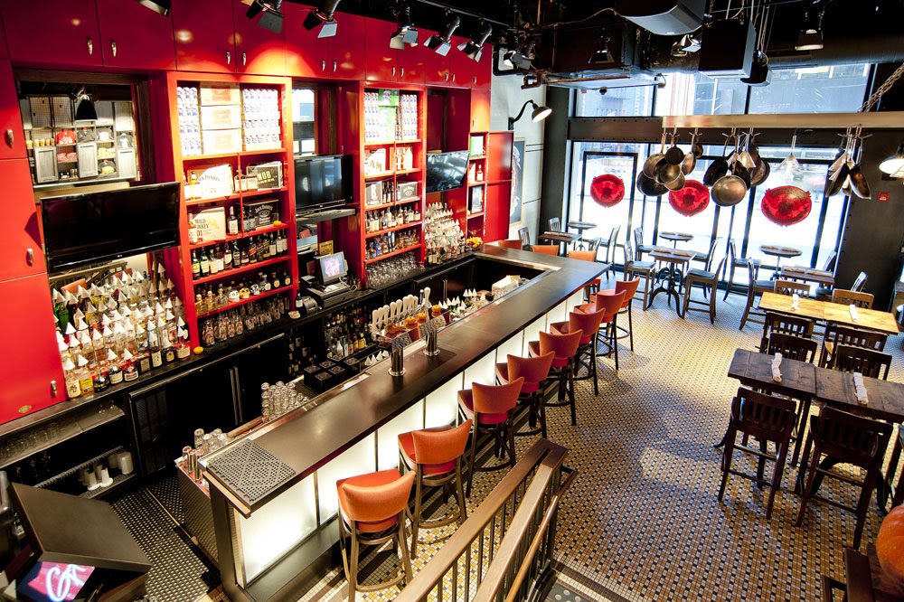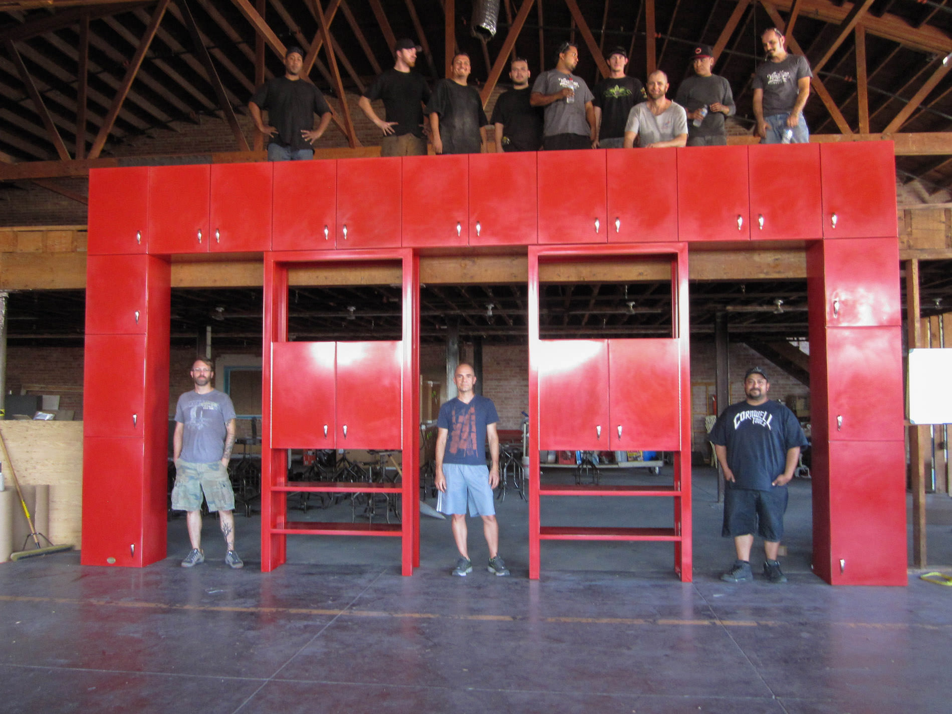 Take a look at the red shelving system we made for celebrity chef Guy Fieri’s restaurant in Time Square. It’s 24′ wide x 14′ tall and was powdercoated red and aged to give it a 1950s feel. It’s modular which makes it easy to ship and install. This is a good example of the custom work we can do.
