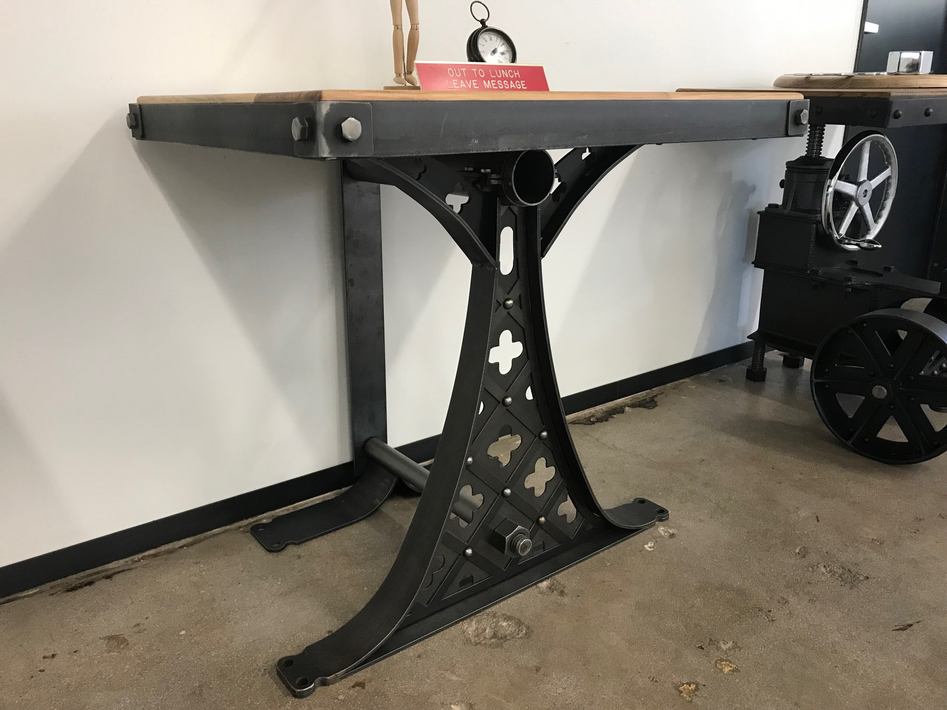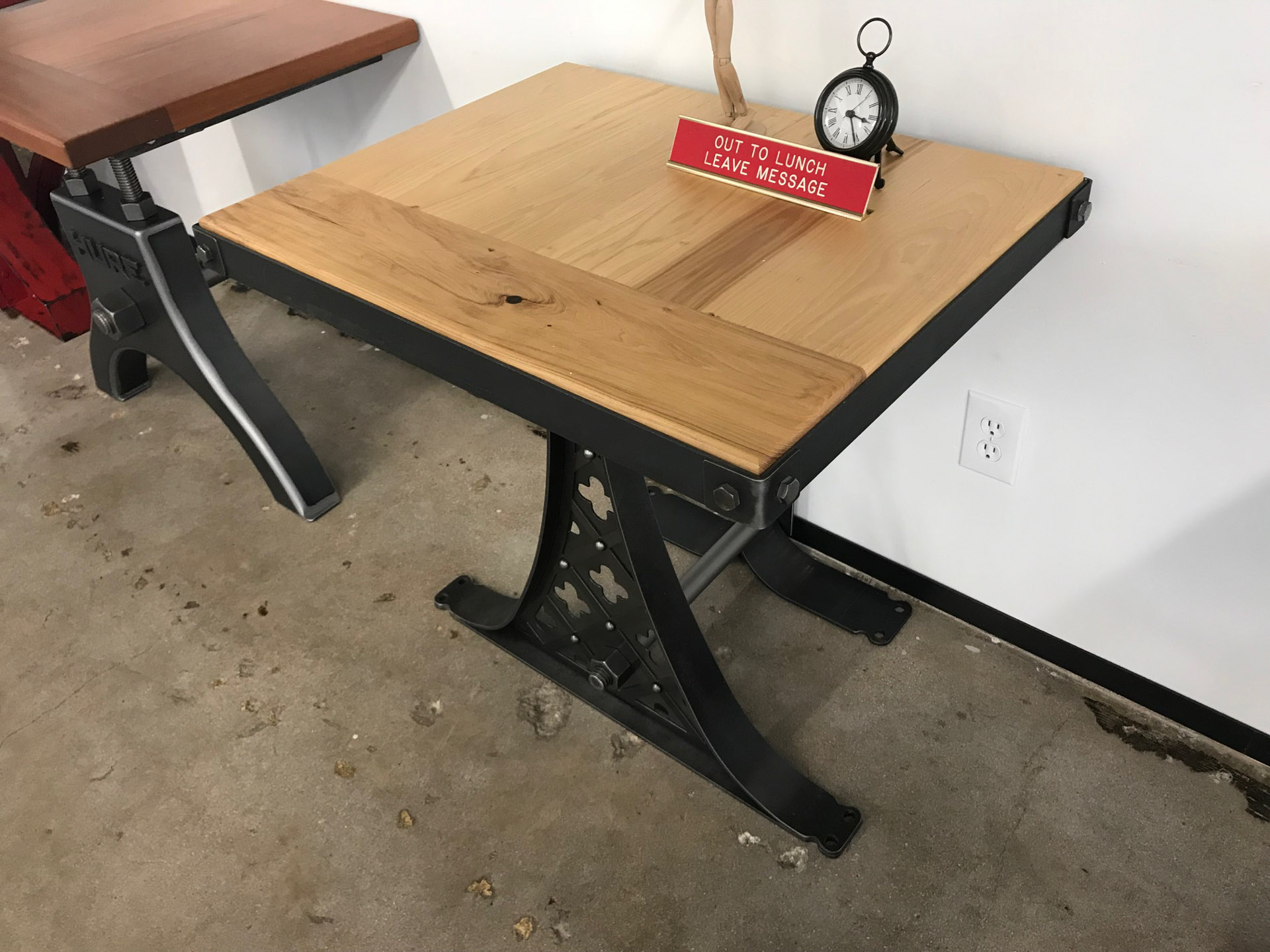 We made this as a demo table for a trade show. It’s a Quatre table built to lean up against or be bolted to a wall. This one of a kind piece would make a killer side table. The top is made from hickory, and the base has a natural steel finish. Priced at around half price.