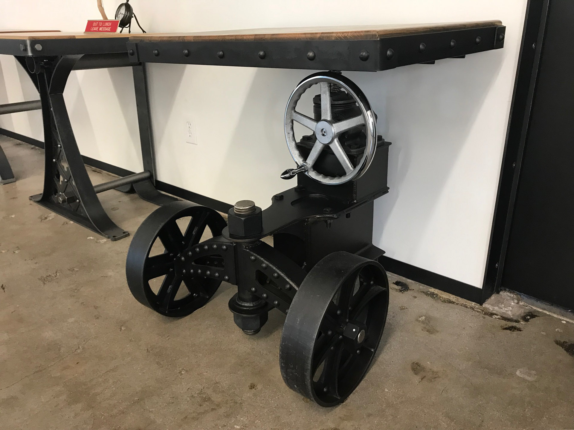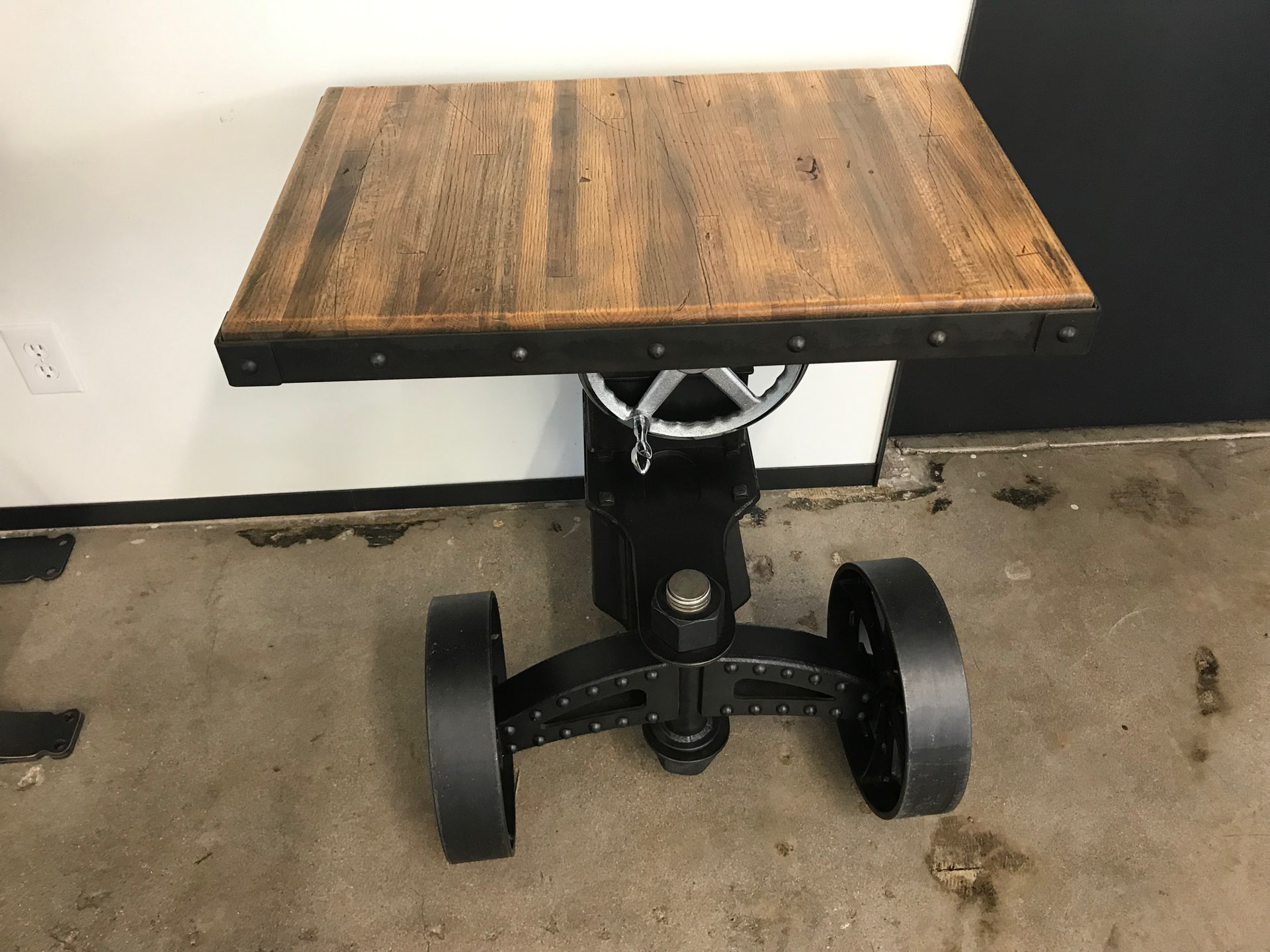 We made this as a demo table for a trade show. It’s a Train table built to lean up against or be bolted to a wall, although it is free standing. This one of a kind piece would make a killer side table. The top is made from our reclaimed boxcar oak, and the base has a blackened steel finish. The chrome crank handle turns and will adjust the top up and down from dining to bar height. Priced at around half price.