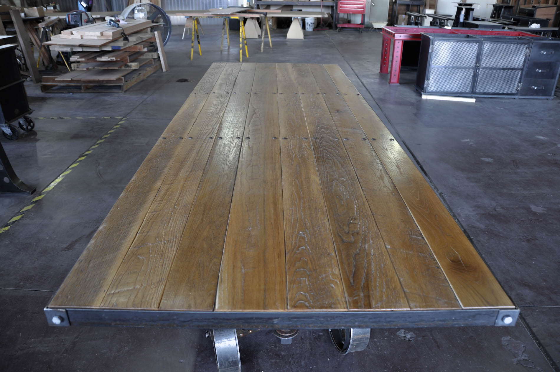 Top: Distressed oak plank top with bolted corner metal trim, or steel top (custom tops available)