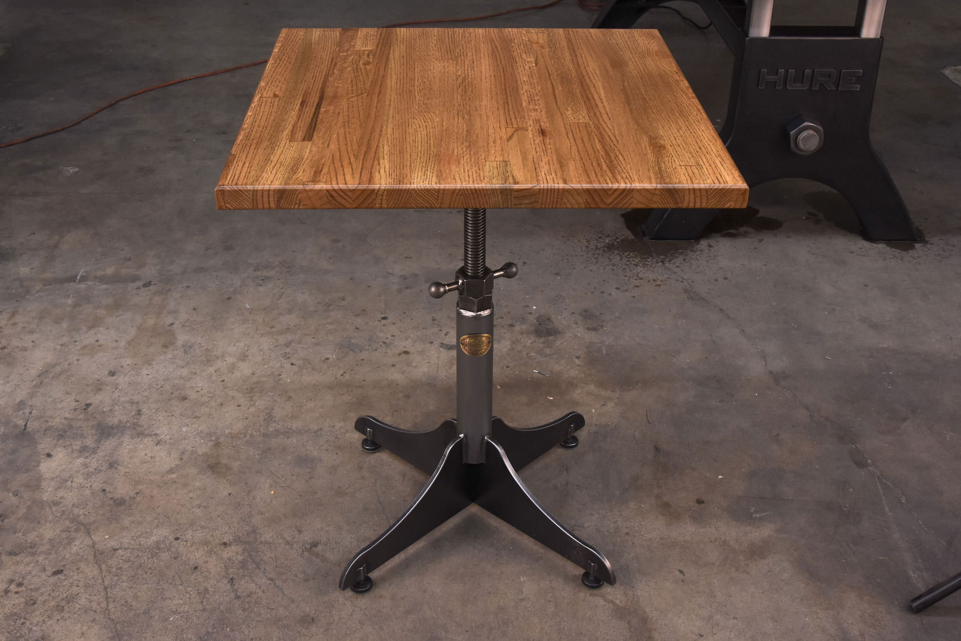 Starting price includes a 24″ x 24″ reclaimed boxcar oak top with a fixed or adjustable height